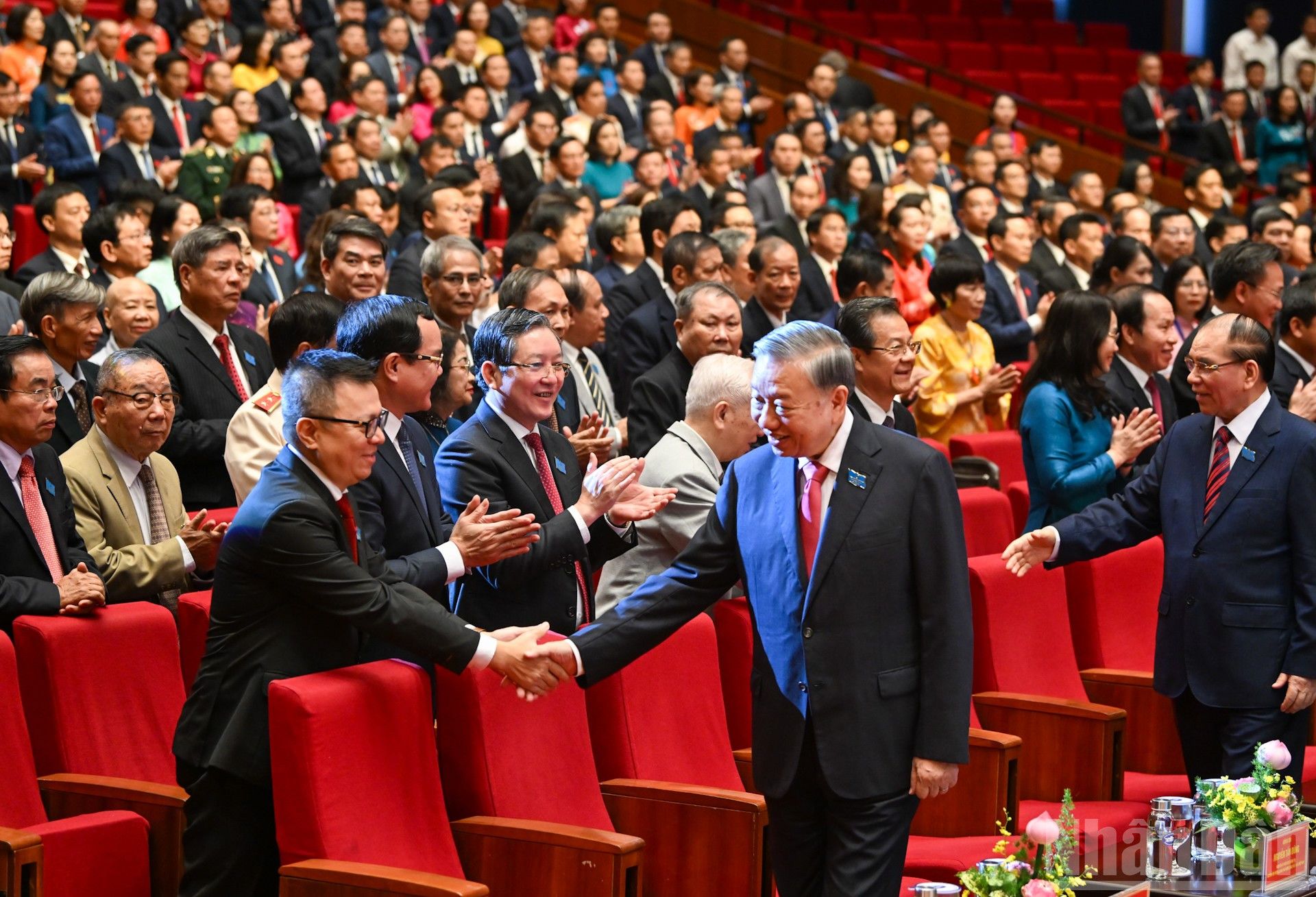 Le secrétaire général du PCV To Lam, accompagné des dirigeants actuels et anciens du Parti et de l’État, ainsi que des délégués, assiste au Congrès. Photo : Thuy Nguyen.