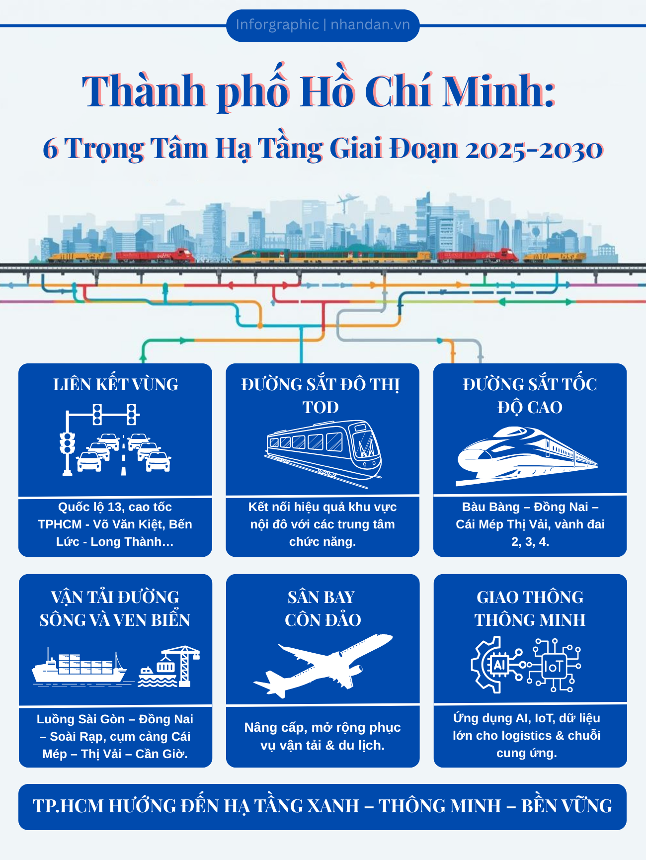Tuy nhiên, dự thảo báo cáo chính trị cũng nhìn nhận Thành phố vẫn đối mặt với nhiều khó khăn do kết cấu hạ tầng chưa đồng bộ. Do đó trong nhiệm kỳ mới, Thành phố Hồ Chí Minh xác định sẽ ưu tiên phát triển mạng lưới giao thông tích hợp và thông minh, góp phần kết nối vùng - liên vùng: hệ thống đường sắt đô thị, đường sắt chuyên dùng liên vùng, các tuyến cao tốc kết nối các trung tâm đô thị - công nghiệp - cảng biển - cảng hàng không - trung tâm tài chính.