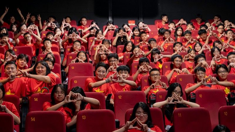 Các thầy cô giáo và học sinh Trường trung học cơ sở và trung học phổ thông Lương Thế Vinh tại rạp chiếu để đón chờ xem phim "Mưa đỏ".