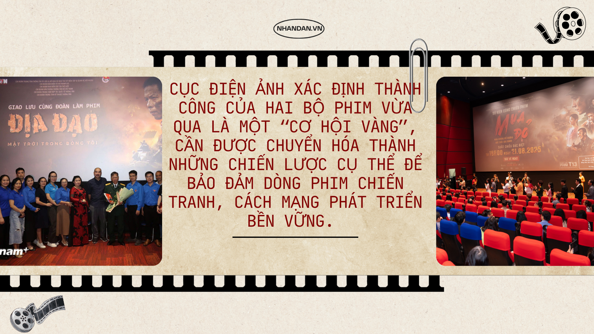 Trước thành công của loạt phim lịch sử, chiến tranh cách mạng như “Mưa đỏ”, “Địa đạo: Mặt trời trong bóng tối” và “Đào, Phở và Piano”, Cục Điện ảnh cho biết, Cục đã xác định đây là “cơ hội vàng” để xây dựng những chiến lược cụ thể, để bảo đảm dòng phim chiến tranh, cách mạng phát triển bền vững.