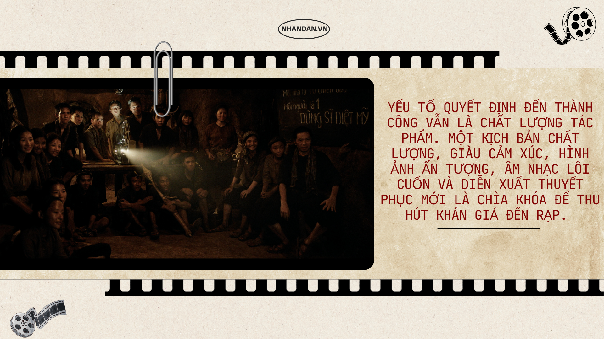 Tuy nhiên, ông cho rằng yếu tố quyết định đến thành công vẫn là chất lượng tác phẩm. Một kịch bản chất lượng, giàu cảm xúc, hình ảnh ấn tượng, âm nhạc lôi cuốn và diễn xuất thuyết phục mới là chìa khóa để thu hút khán giả đến rạp. Các bộ phim thành công không đi theo lối mòn mà tập trung vào những câu chuyện dung dị về thân phận con người trong bối cảnh chiến tranh được tái hiện một cách chân thật. Thông điệp về giá trị của hòa bình, tình yêu đất nước và sự hy sinh được truyền tải trong nhiều chi tiết nhỏ nhưng đầy ý nghĩa, chạm đến trái tim người xem. Bên cạnh sự đầu tư công phu về bối cảnh và kỹ thuật, cả hai bộ phim đều có ngôn ngữ điện ảnh chuyên nghiệp và diễn xuất ấn tượng.