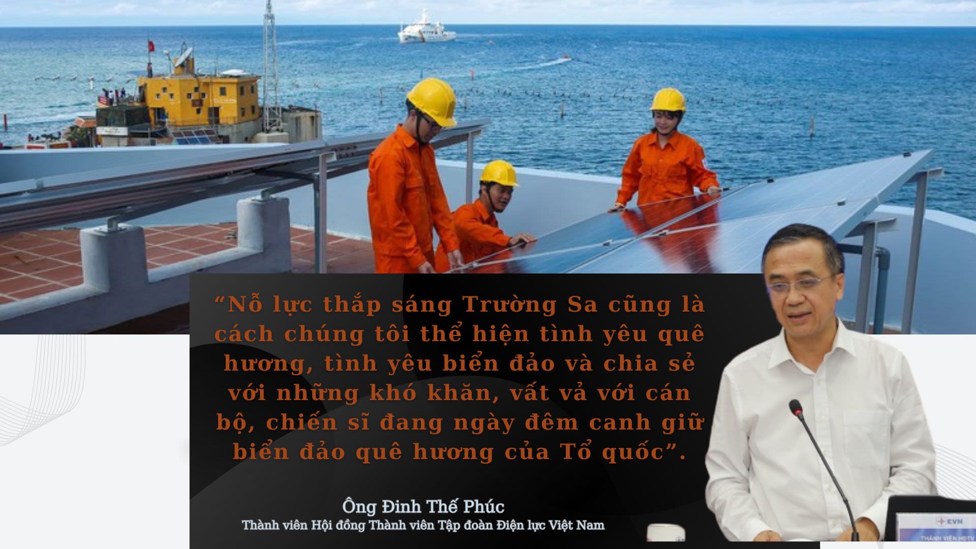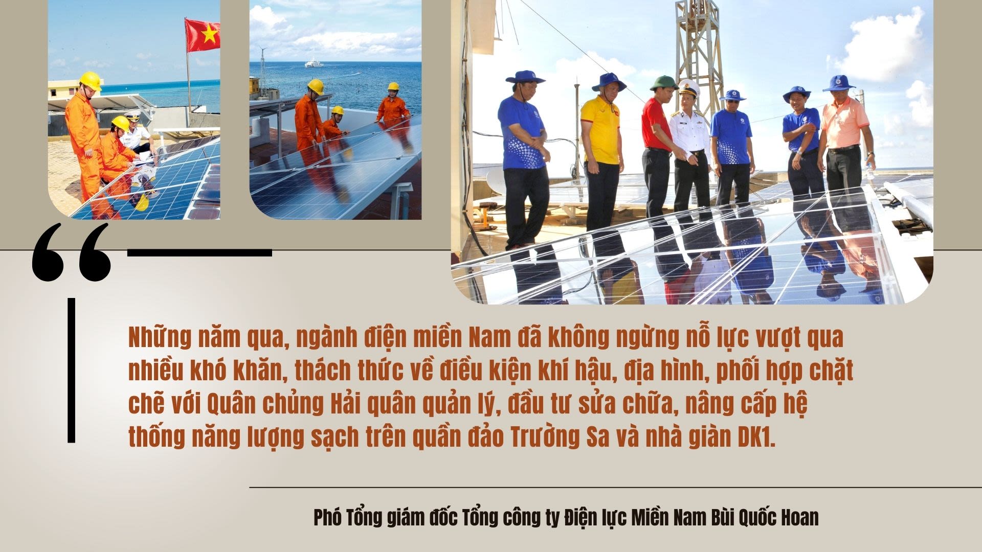 "Tập đoàn và các đơn vị xác định việc quản lý vận hành, bảo đảm cung cấp điện an toàn, tin cây phục vụ quân và dân trên quần đảo Trường Sa và nhà giàn DK1 là nhiệm vụ chính trị đặc biệt quan trọng nhằm góp phần giữ vững an ninh quốc phòng, bảo vệ chủ quyền, phát triển kinh tế biển đảo, nâng cao đời sống của cán bộ, chiến sĩ và nhân dân."