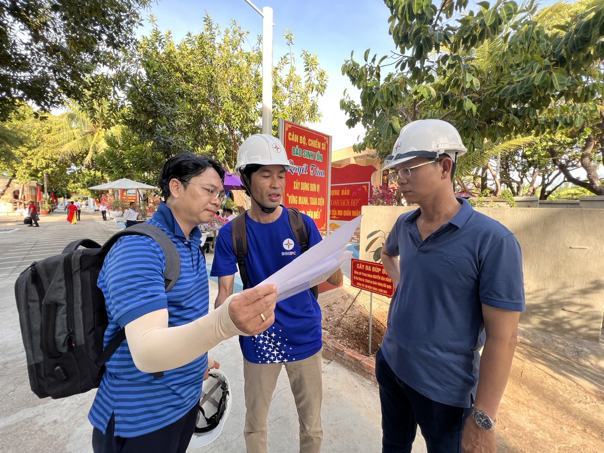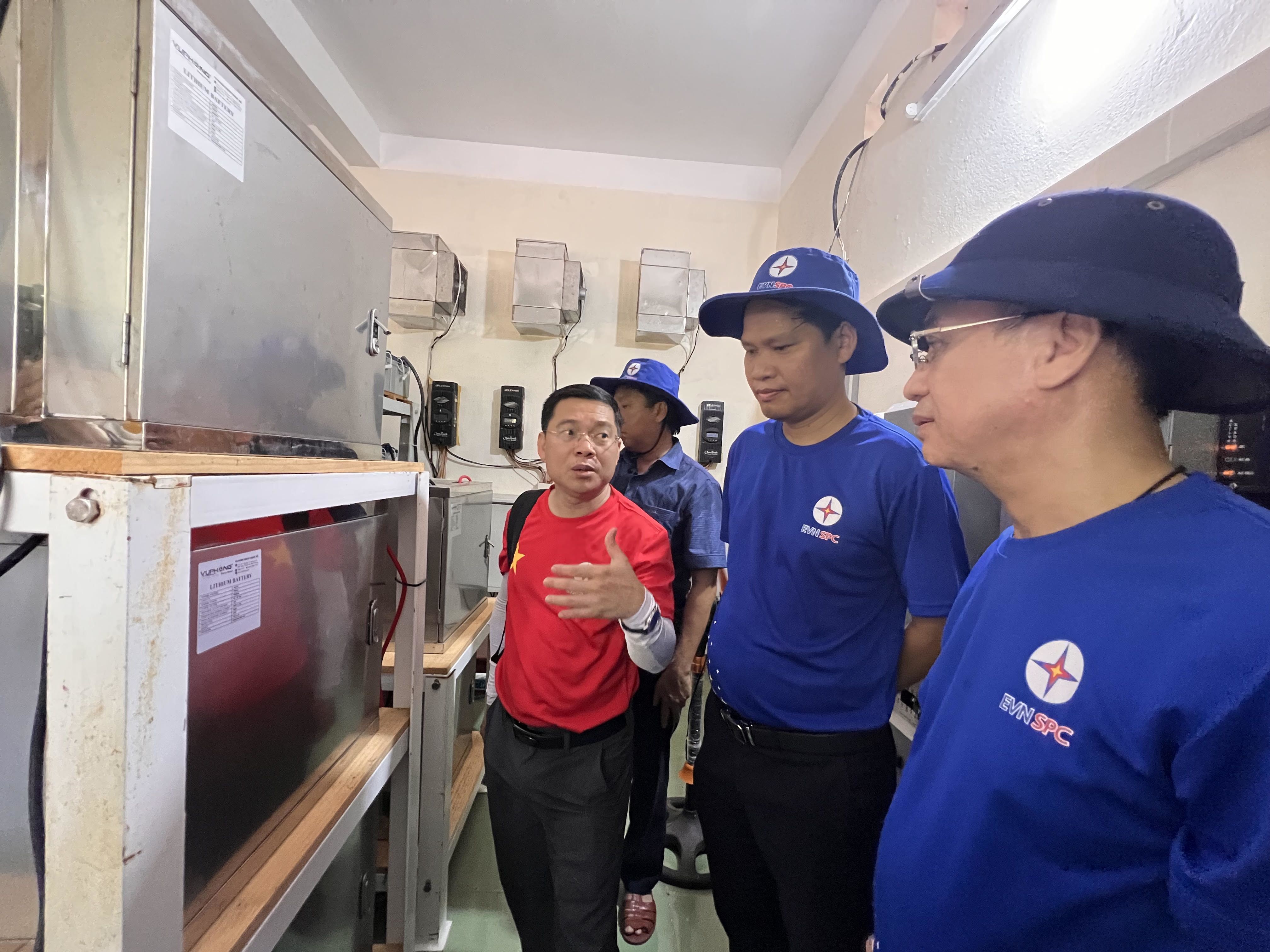 Lãnh đạo Tập đoàn Điện lực Việt Nam và Tổng công ty Điện lực Miền Nam khảo sát, kiểm tra các trạm tích điện trên đảo Sinh Tồn.