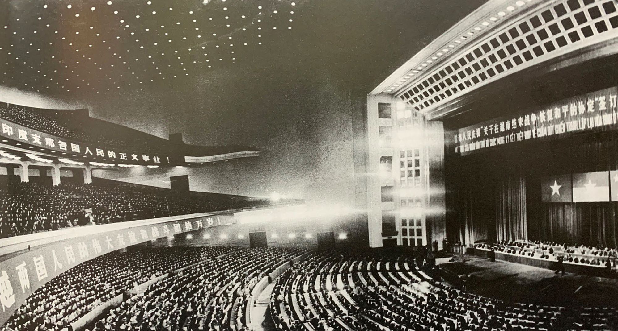 En 1973, dans le Grand Hall du Peuple (Pékin, Chine), des Chinois ont tenu une réunion pour célébrer la signature des Accords de Paris sur la fin de la guerre et le rétablissement de la paix au Vietnam.
