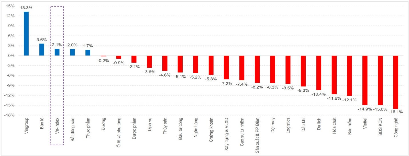 Độ rộng thị trường ghi nhận một tuần điều chỉnh trên diện rộng, các nhóm cổ phiếu ngược dòng thị trường như: Bất động sản (+7,4%), hàng không (+2,9%), bán lẻ (+2,3%), Vingroup (+1,4%)… một số nhóm cổ phiếu giảm mạnh gồm: công nghệ (-8%), bảo hiểm (-5,7%), Viettel (-4,7%), xây dựng và vật liệu xây dựng (-4,3%)…