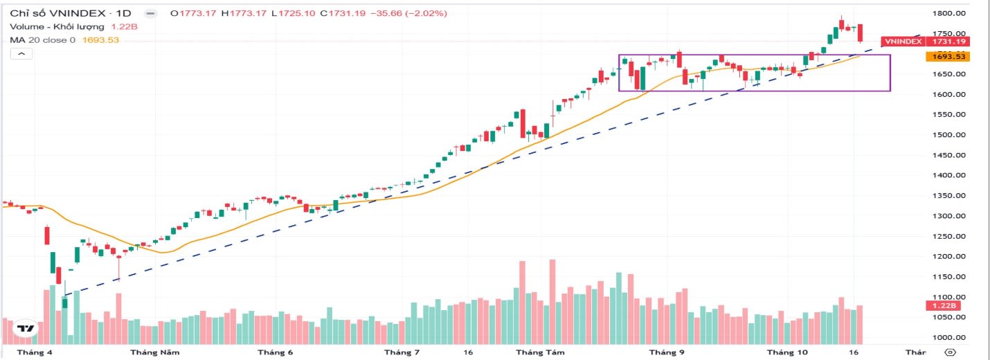 TThị trường chứng khoán trong nước vừa trải qua một tuần biến động khá mạnh, đặc biệt là phiên giảm khá mạnh cuối tuần (17/10). Tuy nhiên, nhiều nhận định cho thấy, đây chỉ là phiên điều chỉnh bình thường trước áp lực chốt lời và phiên đáo hạn phái sinh. Do vậy, thị trường vẫn chưa có dấu hiệu rõ ràng cho nhận định “gãy sóng tăng”, cơ hội tăng vẫn còn khi dòng tiền vẫn duy trì tốt và hướng tới nhóm cổ phiếu có kết quả kinh doanh tích cực.