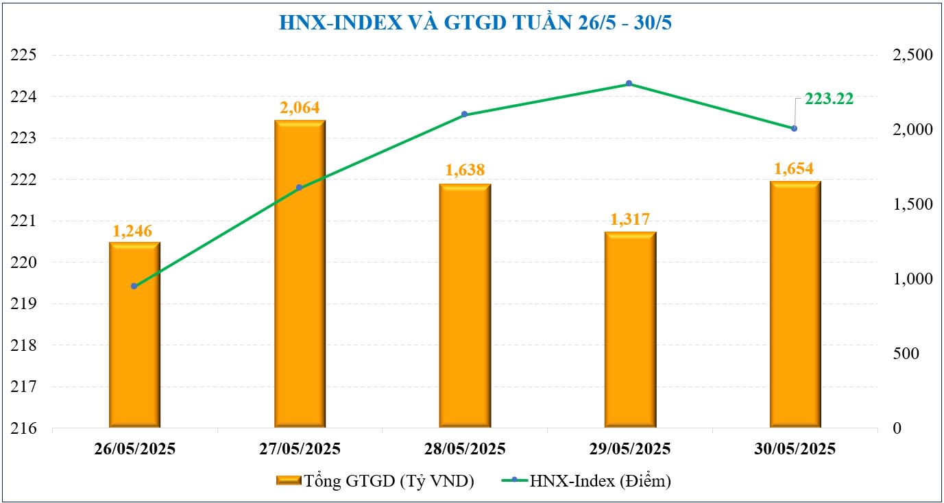 Trên sàn Hà Nội, hai chỉ số chính cũng có diễn biến tích cực. Trong đó, chỉ số HNX-Index có tuần tăng +6,9 điểm, kết tuần tại 223,22 điểm, tương ứng mức tăng +3,19 so với tuần trước. Còn chỉ số UPCoM-Index tăng +2,27 điểm để đóng cửa tại 98,49 điểm.