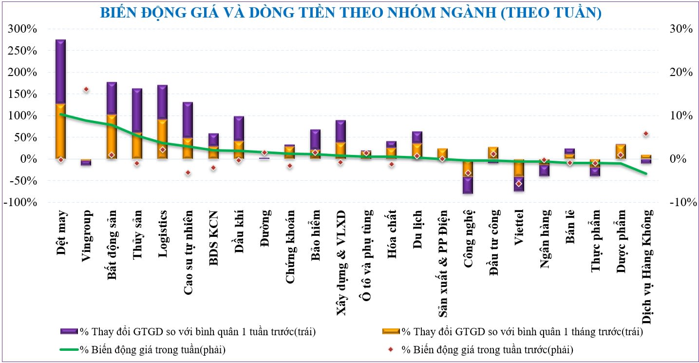 Trong tuần, độ rộng thị trường đã có sự cải thiện so với tuần kế trước khi dòng tiền bắt đáy nhóm cổ phiếu xuất khẩu, trong khi nhóm cổ phiếu trụ vẫn đóng vai trò nâng đỡ thị trường. Một số nhóm cổ phiếu có mức tăng nổi bật: Dệt may (+10,33%), Vingroup (+8,84%), Bất động sản (+7,83%), Thủy sản (+5,31%), Logistics (+3,67%), …