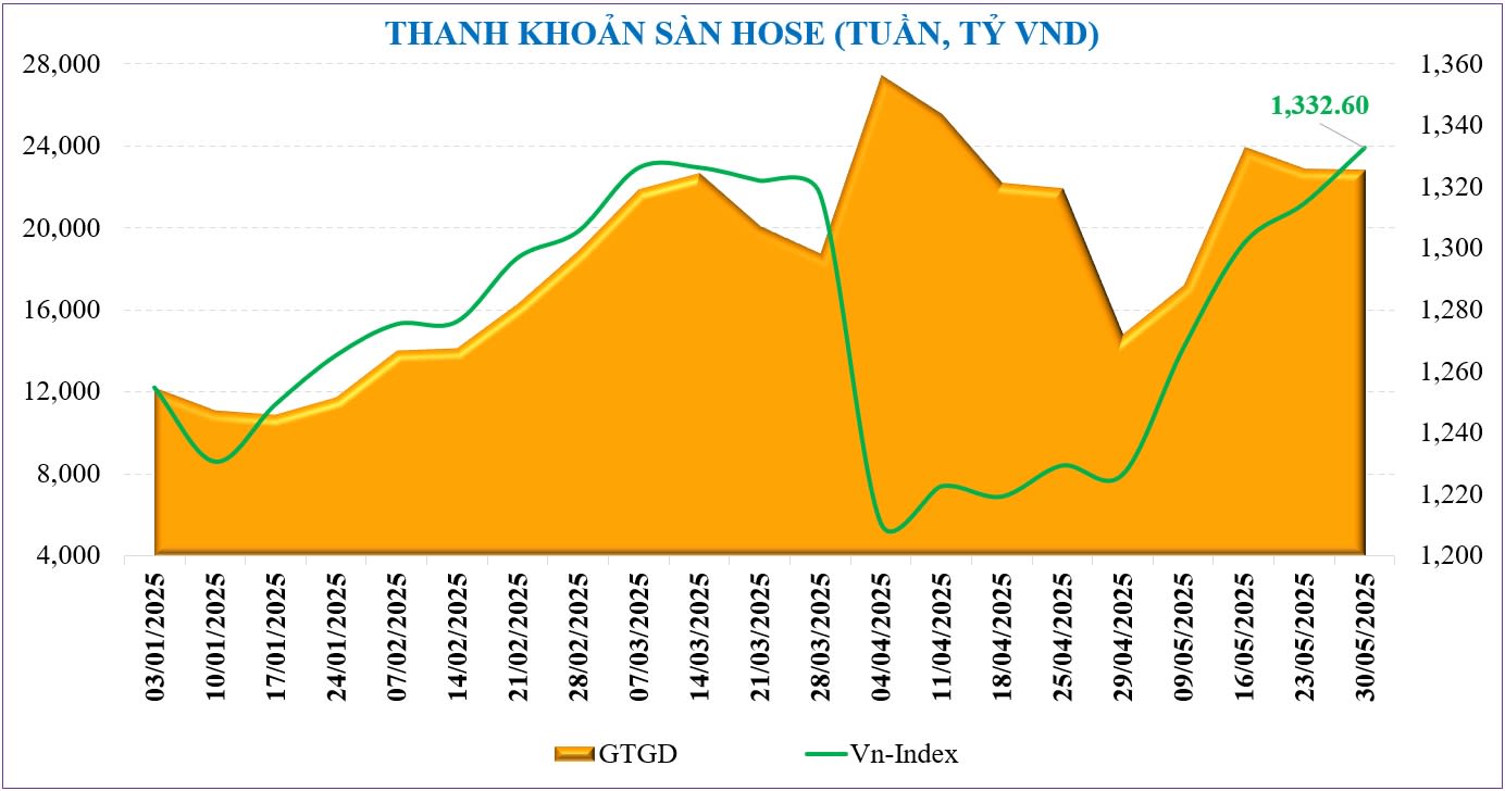 Thị trường chứng khoán trong nước tiếp tục có một tuần tăng điểm (26-30/5), khép lại một tháng 5 không có “sell in May”. Thanh khoản tiếp tục tăng, mặc dù khối ngoại gia tăng bán ròng. Thị trường khởi đầu tháng 6 (2-6/6) vào yếu tố mùa vụ ít thông tin, lại đang giao dịch ở vùng đỉnh nên khả năng điều chỉnh gia tăng; tuy nhiên, điều quan trọng nhất là dòng tiền sẽ duy trì và luân chuyểnn hay không khi kỳ vọng về kết quả đàm phán thuế quan có thể là trợ lực tạo bất ngờ.