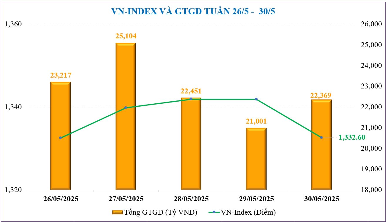 Thị trường chứng khoán Việt Nam có một tuần cuối cùng tháng 5 duy trì đà tăng điểm, dù áp lực bán đã xuất hiện phiên cuối tuần khiến thị trường điều chỉnh. Theo đó, chỉ số VN-Index chốt tuần ở mức 1.332,6 điểm, tăng +18,14 điểm, tương đương tăng +1,38% so với tuần trước. Như vậy, chỉ số này đã có tuần tăng thứ 4 liên tiếp và ghi nhận một “Tháng 5 rực rỡ” và không hề có “sell in May”.