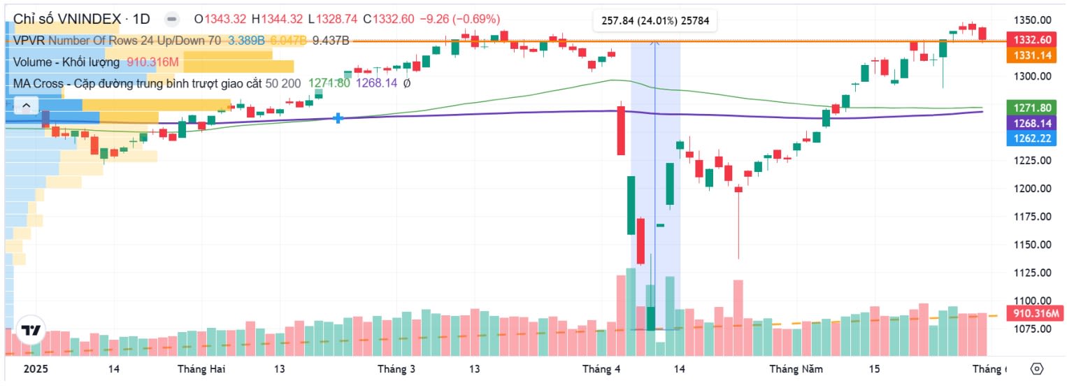 Trên thực tế, có thời điểm chỉ số này đã vượt vùng đỉnh cũ 1.330 -1.340 điểm khi đạt ngưỡng cao nhất 1.348,31 điểm.