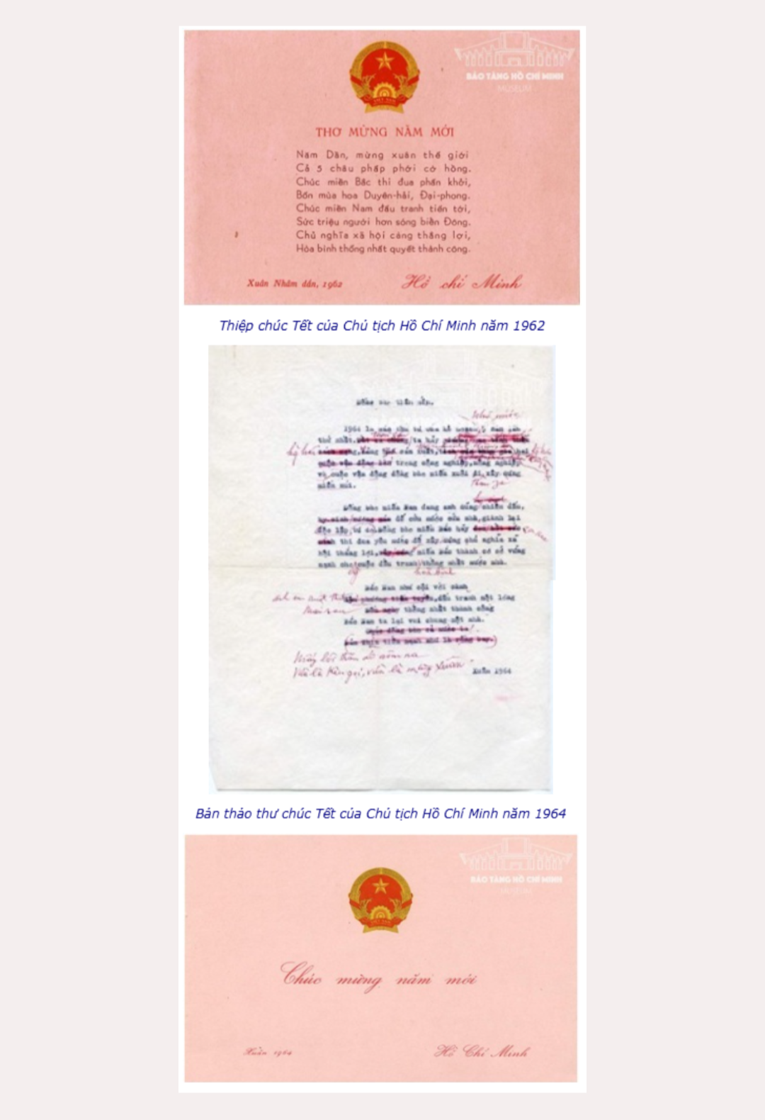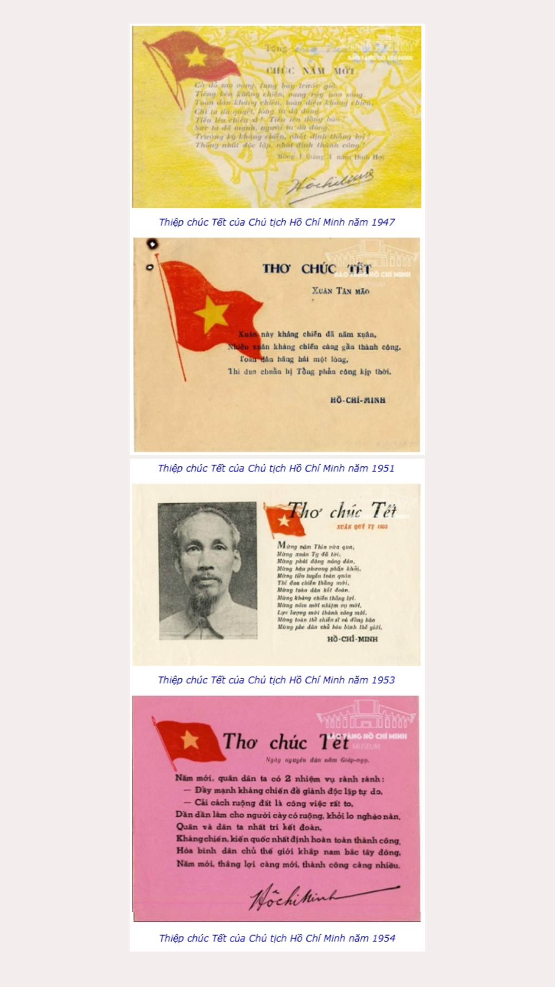 Bài thơ chúc Tết đầu tiên Người viết vào Xuân năm 1942 tại núi rừng Việt Bắc, khi đó Bác dự báo: “Tháng ngày thấm thoát chóng như thoi/ Nǎm cũ qua rồi, chúc nǎm mới:/ Chúc phe xâm lược sẽ diệt vong !/ Chúc phe dân chủ sẽ thắng lợi !/Chúc đồng bào ta đoàn kết mau !/ Chúc Việt Minh ta càng tấn tới/ Chúc toàn quốc ta trong nǎm này/ Cờ đỏ ngôi sao bay phất phới!/ Nǎm này là nǎm Tết vẻ vang/ Cách mệnh thành công khắp thế giới”. Cũng năm này, lần đầu tiên Bác nói về “cờ đỏ sao vàng” trong thơ chúc Tết: “Cờ đỏ ngôi sao bay phất phới!/ Nǎm này là nǎm Tết vẻ vang”.