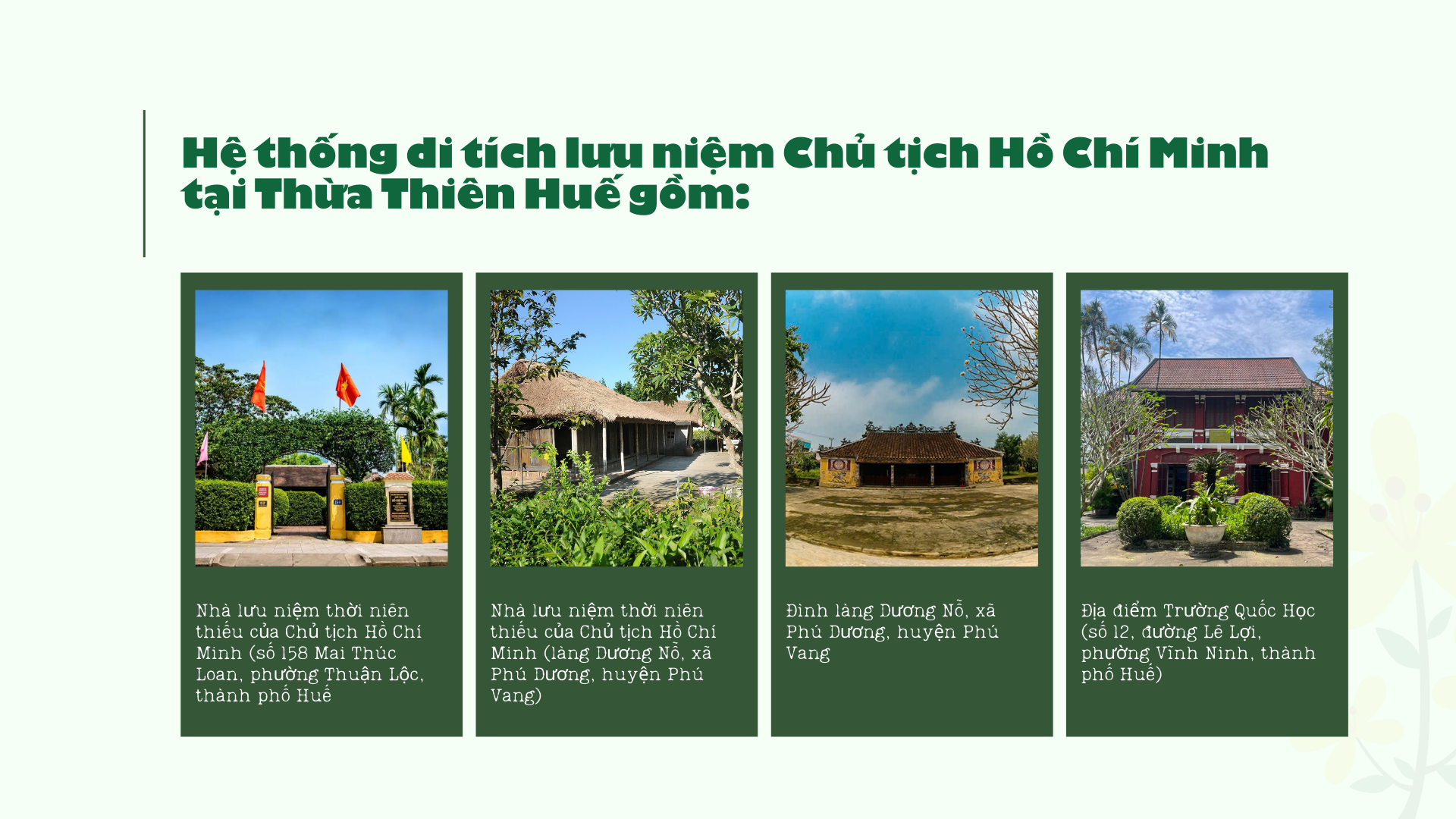 Hồ sơ di sản của Cục Di sản nêu rõ, 4 di tích cấp quốc gia đặc biệt trong Hệ thống di tích lưu niệm Chủ tịch Hồ Chí Minh tại Thừa Thiên Huế gồm: Nhà lưu niệm thời niên thiếu của Chủ tịch Hồ Chí Minh (số 158 Mai Thúc Loan, phường Thuận Lộc, thành phố Huế; Nhà lưu niệm thời niên thiếu của Chủ tịch Hồ Chí Minh (làng Dương Nỗ, xã Phú Dương, huyện Phú Vang); Đình làng Dương Nỗ, xã Phú Dương, huyện Phú Vang; Địa điểm Trường Quốc Học (số 12, đường Lê Lợi, phường Vĩnh Ninh, thành phố Huế).