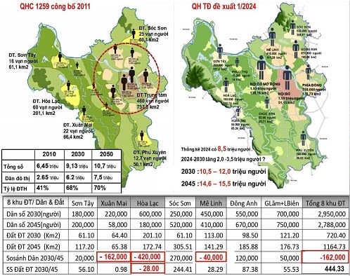 So sánh dự báo dân số Hà Nội trong Quy hoạch Thủ đô 2024 với dự báo trong QHC 1259 công bố 2011 : tới năm 2030 nhiều hơn 2,87 triệu người (từ 9,13 triệu lên 12,0 triệu người). Tới năm 2050 nhiều hơn gần 5 triệu người (từ 10,7 triệu lên 15,5 triệu người) lấy đó làm lý do tiếp tục giảm đất tự nhiên, nông nghiệp để mở rộng đô thị. Dự báo này còn thiếu lập luận khoa học và thực tiễn , cần rà soát đánh giá thận trọng, tránh lãng phí tài nguyên đất đai tài chính đô thị, làm thiếu hụt tài nguyên dự trữ để phát triển bền vững lâu dài.