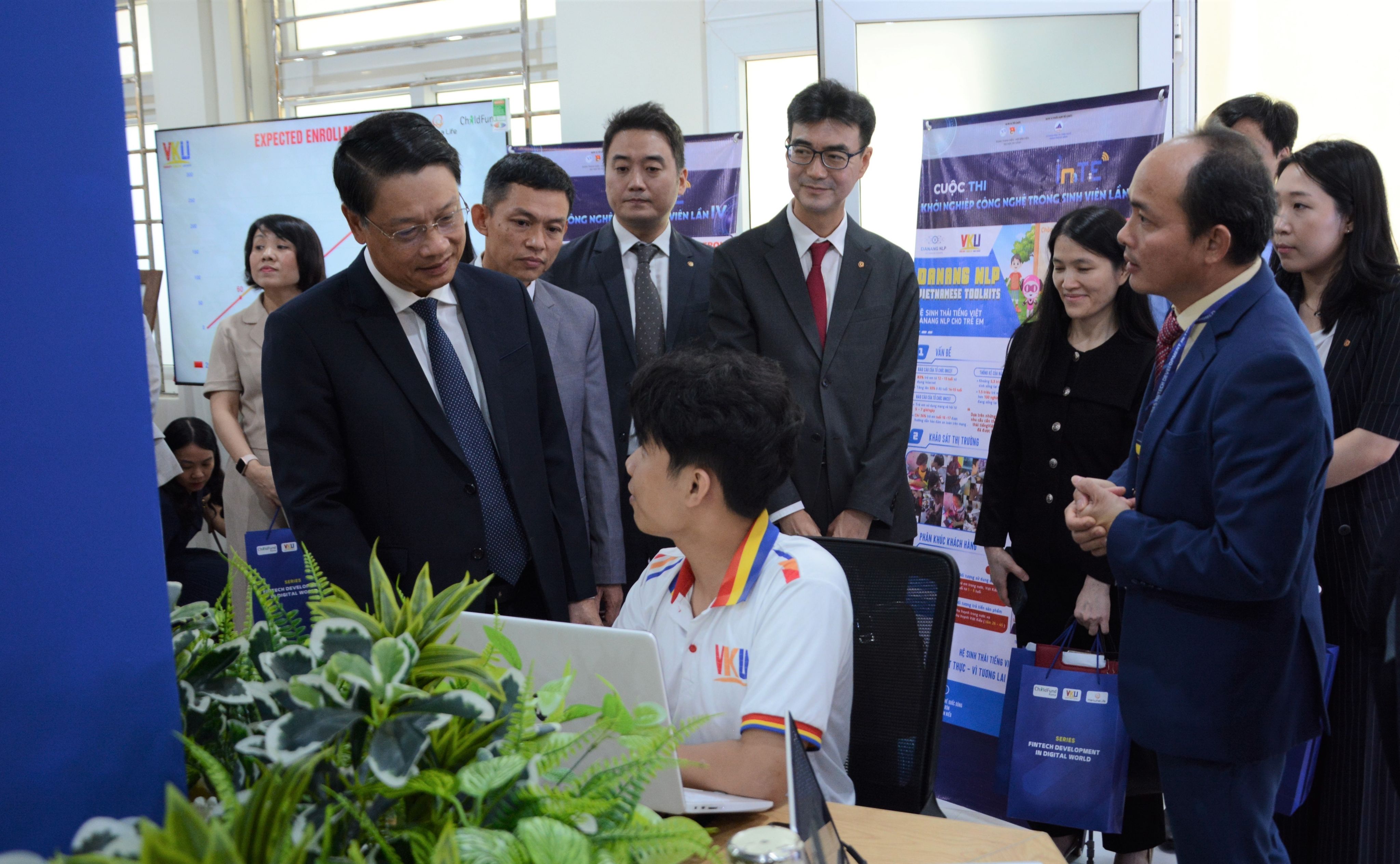 Lãnh đạo thành phố Đà Nẵng động viên sinh viên đang thực hành tại Trung tâm đào tạo, nghiên cứu và đổi mới sáng tạo (VKU Fintech Hub). (Ảnh: TTXVN)