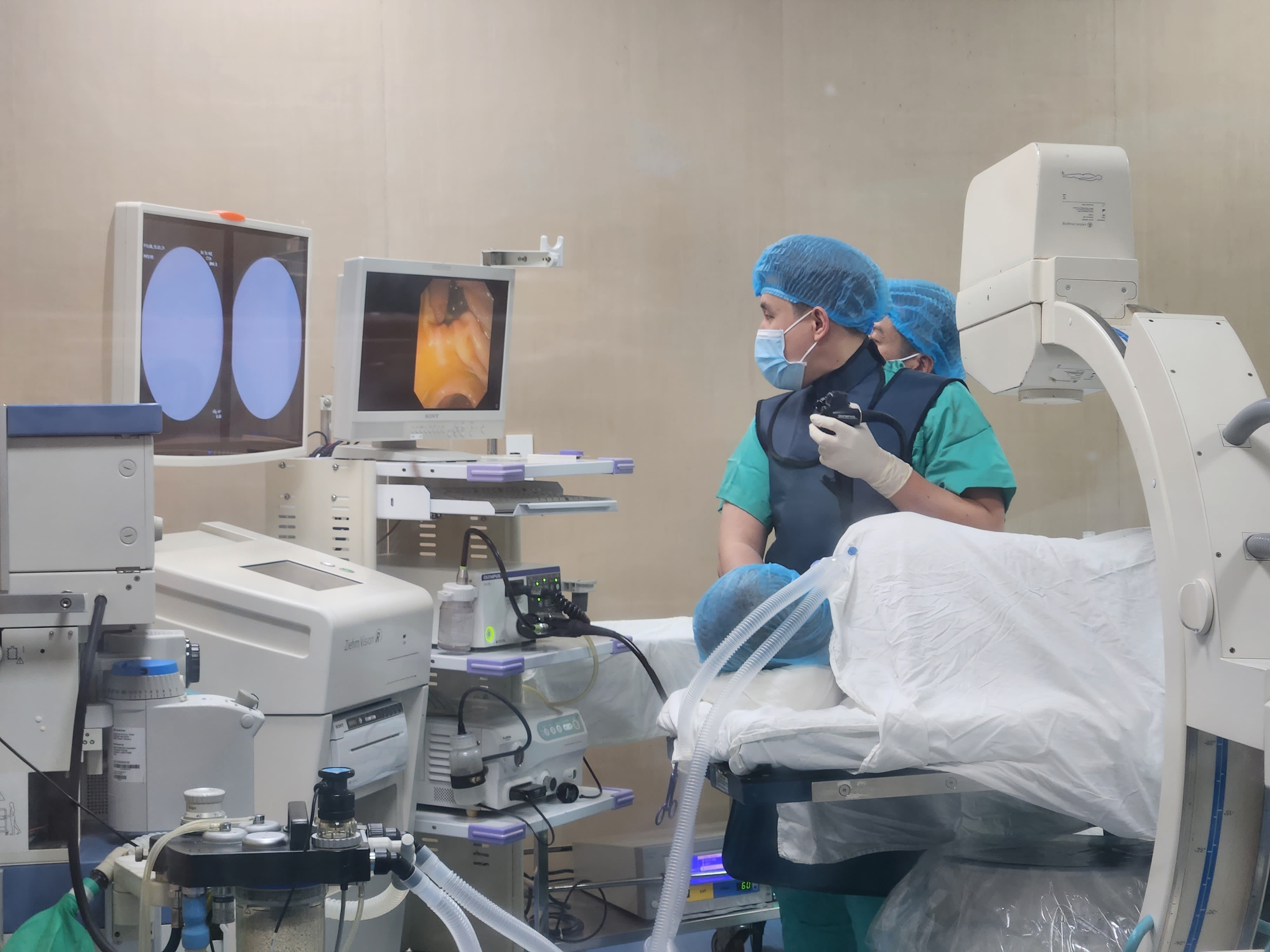 Thạc sĩ Phạm Như Hiển, Chủ tịch Hội Thầy thuốc trẻ tỉnh Thừa Thiên-Huế, thực hiện ca phẫu thuật nội soi mật tụy ngược dòng. (Ảnh: TTXVN)
