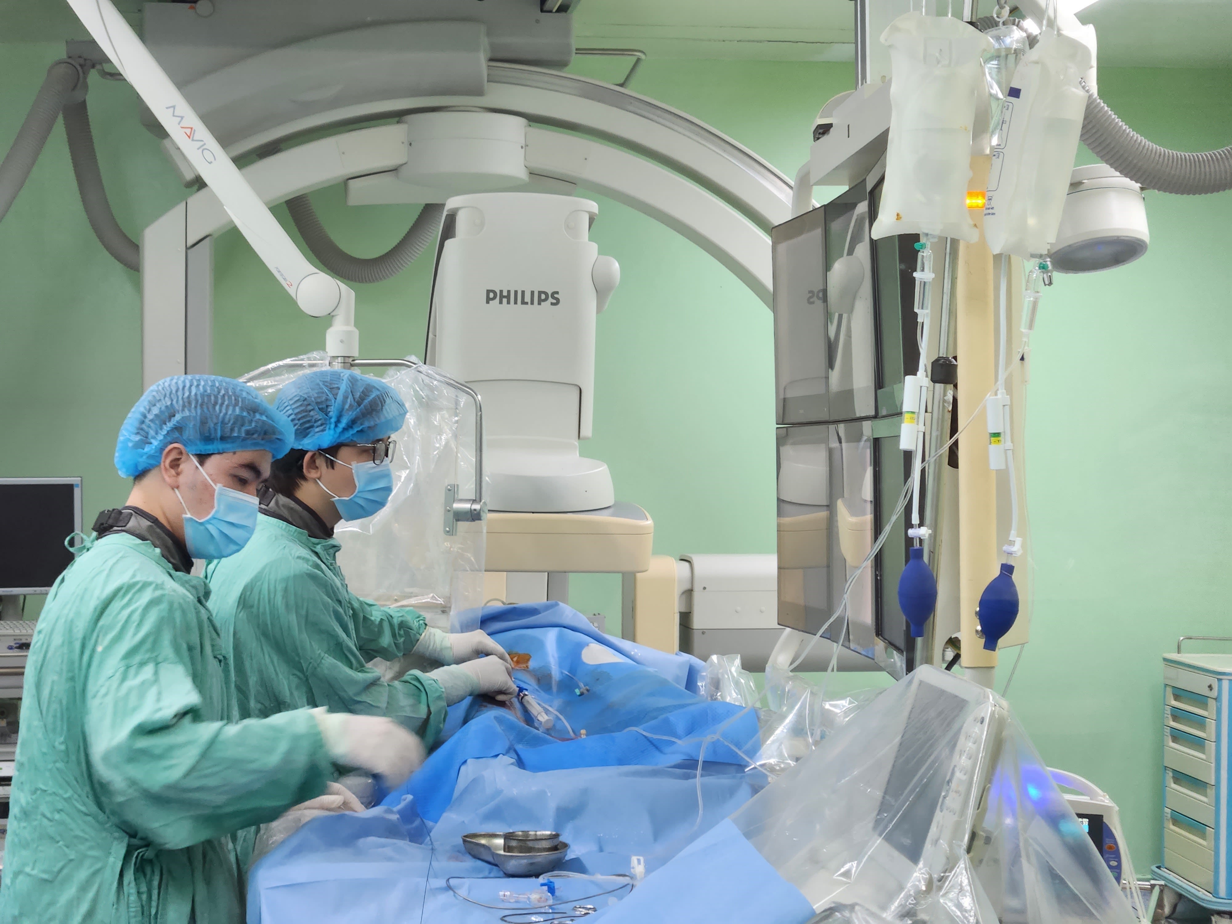 Các bác sĩ trẻ của Bệnh viện Trung ương Huế tham gia can thiệp một trường hợp đột quỵ. (Ảnh: TTXVN)