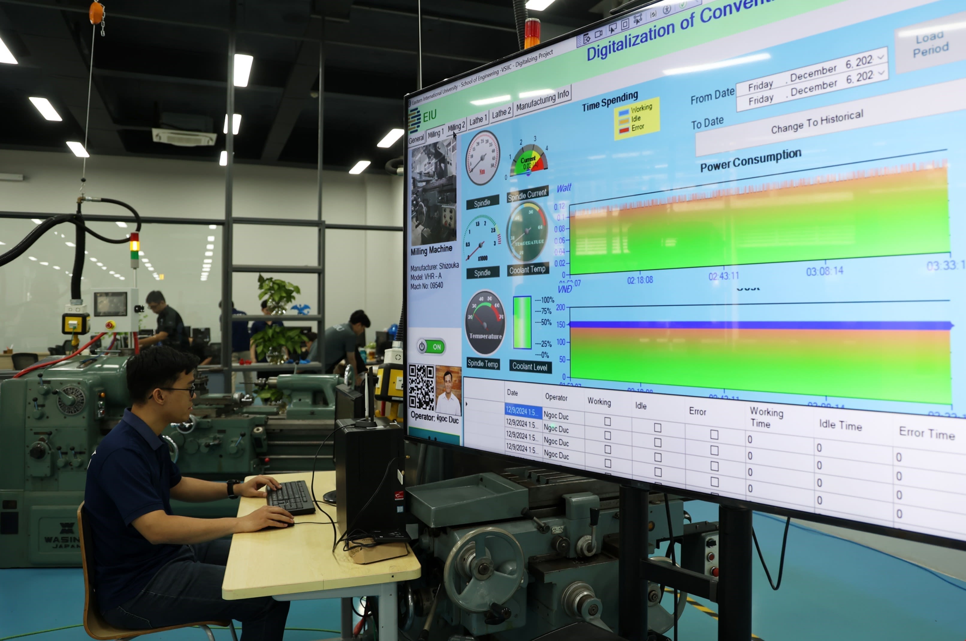 Sinh viên thực hành Bảng điều khiển công nghệ số tại Trung tâm đổi mới công nghệ sáng tạo 4.0, Đại học Quốc tế Miền Đông. (Ảnh: TTXVN)