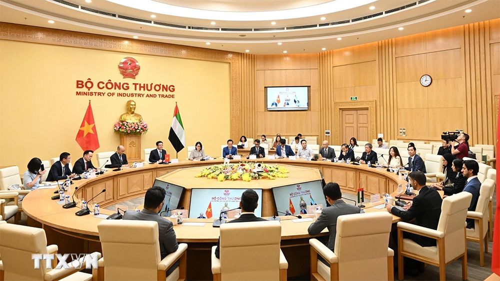 Réunion entre le ministère de l'Industrie et du Commerce du Vietnam et le ministère de l'Économie des Émirats arabes unis, présidée par le ministre vietnamien Nguyen Hong Dien et le secrétaire d'État émirati, Thani bin Ahmed Al Zeyoudi, dans l'après-midi du 30 juillet 2024 à Hanoi. Photo : VNA.