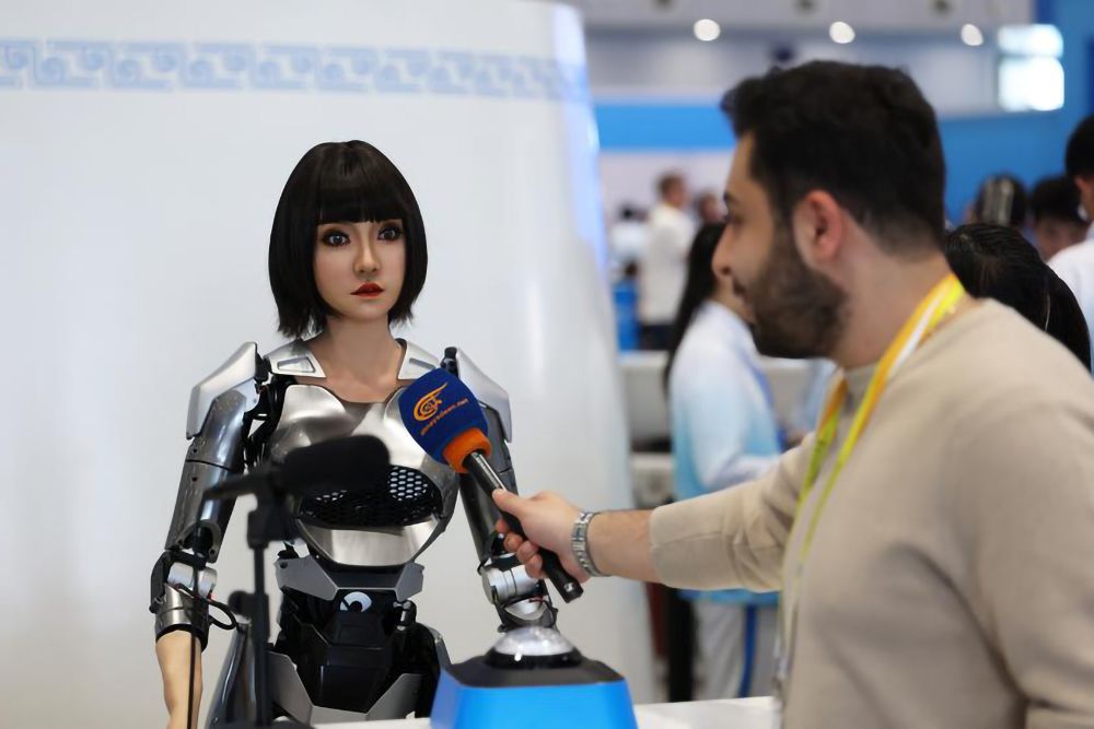 Một phóng viên nước ngoài phỏng vấn robot tại Trung tâm Báo chí của Hội nghị Thượng đỉnh SCO 2025. (Ảnh: Tân Hoa Xã)