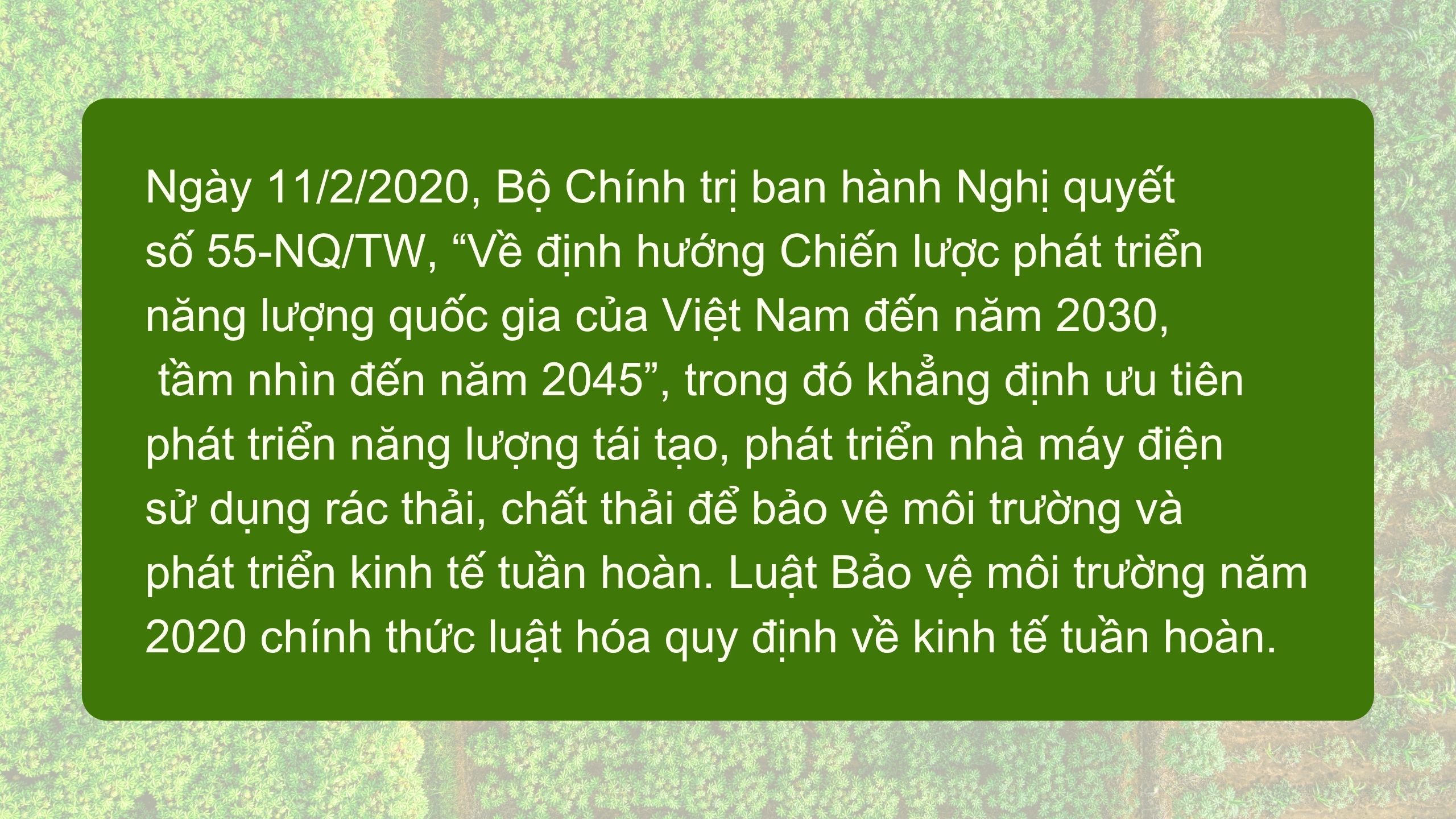 Chủ trương, chính sách của Ðảng và Nhà nước về phát triển kinh tế tuần hoàn hướng đến phát triển bền vững đã được khẳng định. Ðó là việc Việt Nam đang tiếp tục hoàn thiện thể chế kinh tế thị trường định hướng xã hội chủ nghĩa, chuyển đổi từ nền kinh tế tuyến tính tới nền kinh tế tuần hoàn, với nhiều mô hình kinh doanh mới dựa trên sự ứng dụng khoa học-công nghệ và đổi mới về chính sách, góp phần phát triển kinh tế nhanh và bền vững.