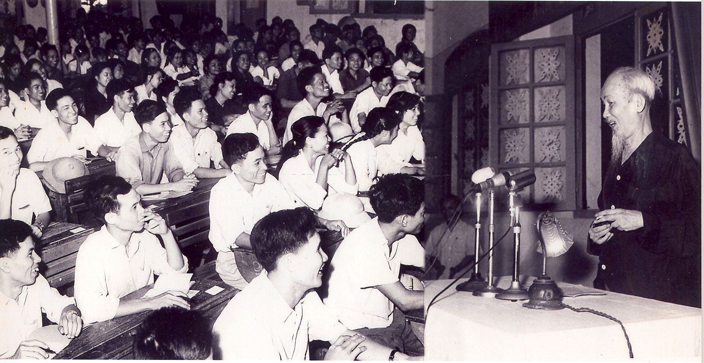 Chủ tịch Hồ Chí Minh nói chuyện với các học viên dự lớp bồi dưỡng đảng viên mới của Đảng bộ Hà Nội (1966). Ảnh: Bảo tàng Hồ Chí Minh