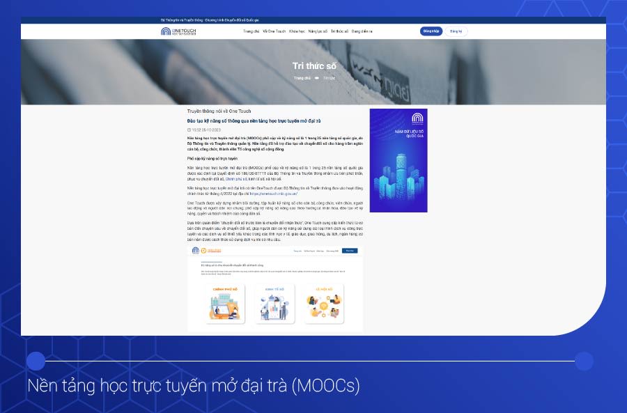 Gần đây, để đào tạo nhân lực cho chuyển đổi số, Bộ Thông tin và Truyền thông đã xây dựng Nền tảng học trực tuyến mở đại trà (MOOCs) để phổ cập kỹ năng số cho mọi đối tượng. Từ 1/1/2023 đến 15/8/2024, Bộ đã tổ chức 10 khóa bồi dưỡng về chuyển đổi số miễn phí trên nền tảng này cho hơn 81.500 cán bộ, công chức, viên chức và người lao động trong các bộ, ngành, địa phương và các tập đoàn, tổng công ty nhà nước. Hỗ trợ 15 bộ, ngành và 49 địa phương sử dụng miễn phí Nền tảng MOOCS đến hết năm 2024.
