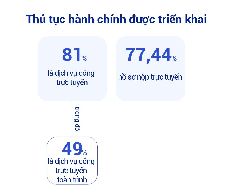 Đến hết 15/9/2024, 81% thủ tục hành chính được triển khai là dịch vụ công trực tuyến, trong đó 49% thủ tục hành chính được triển khai là dịch vụ công trực tuyến toàn trình. Tỷ lệ hồ sơ nộp trực tuyến trên tổng số hồ sơ giải quyết thủ tục hành chính đạt 77,44 %.