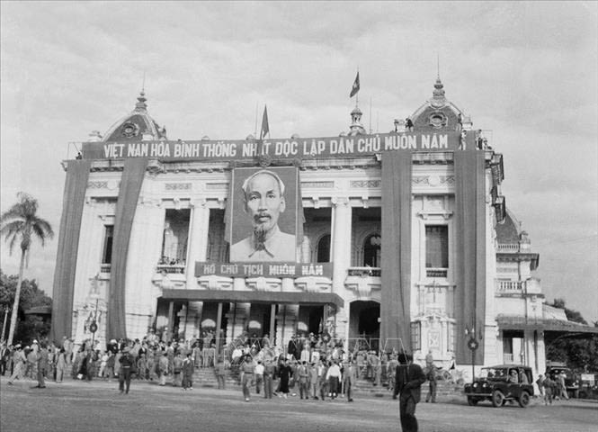 Bên ngoài Nhà hát Lớn Hà Nội ngày 10/10/1954. (Nguồn: Tư liệu TTXVN)