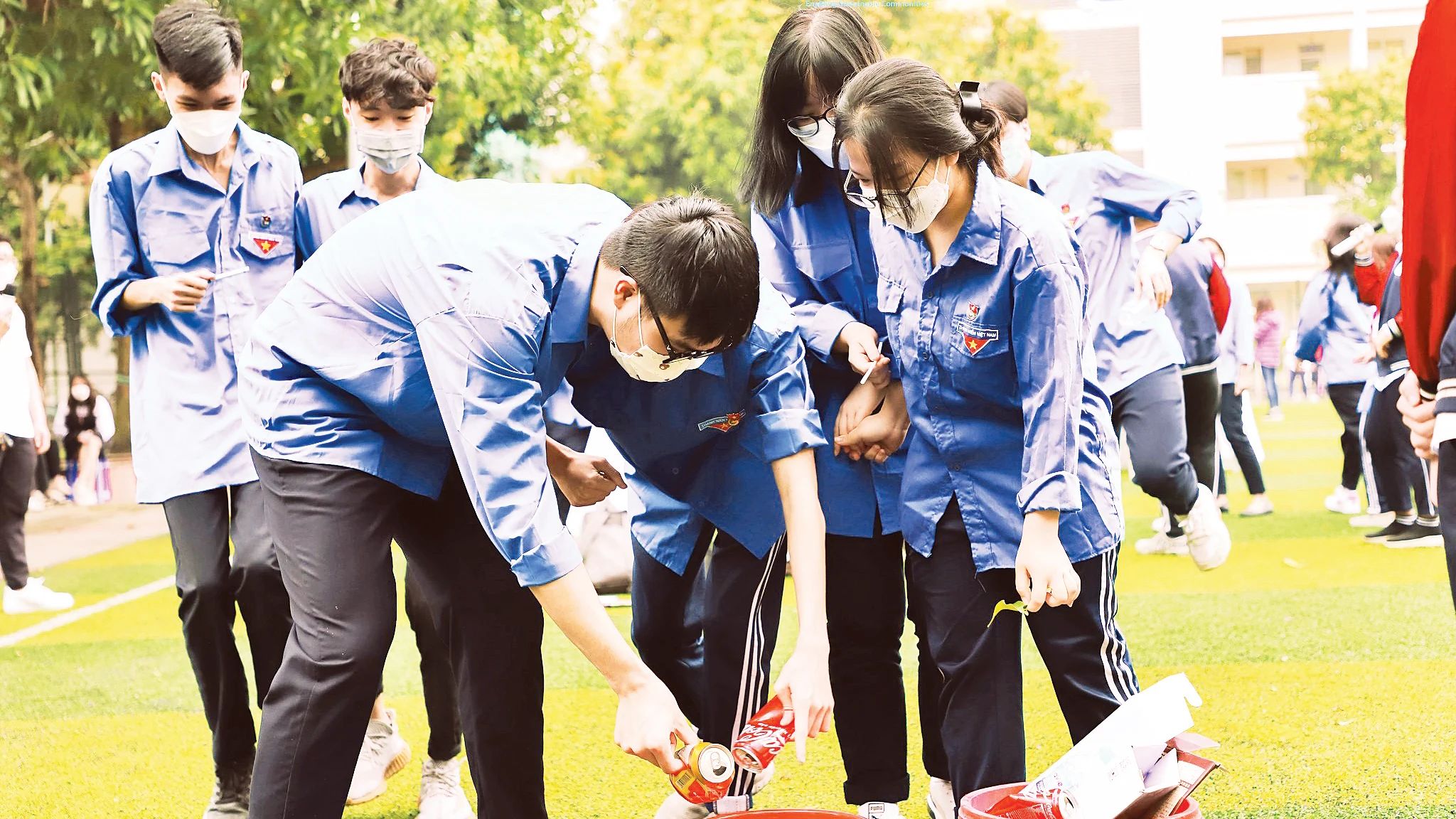 Des élèves de l’école primaire, secondaire et du lycée expérimental en sciences de l’éducation participent à une activité de tri des déchets à travers un jeu ludique. Photo fournie par le Centre d’assistance au développement vert GreenHub.