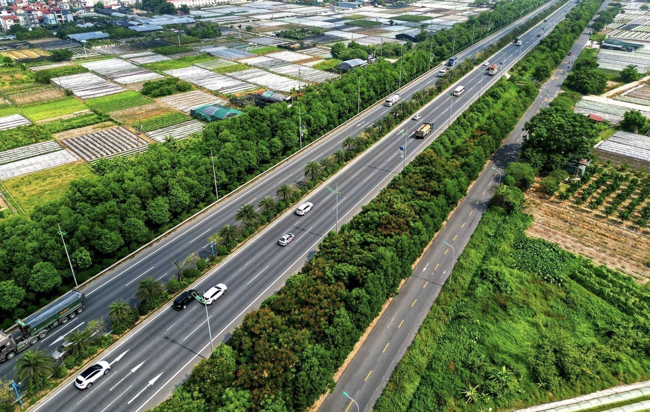 Đường Võ Nguyên Giáp - trục đường chính từ sân bay quốc tế Nội Bài vào trung tâm Hà Nội được trồng nhiều tầng cây xanh, tạo nên ấn tượng trong mắt người dân cũng như khách nước ngoài về một Thủ đô Hà Nội khang trang, đẹp và dịu mát. (Ảnh: TTXVN)