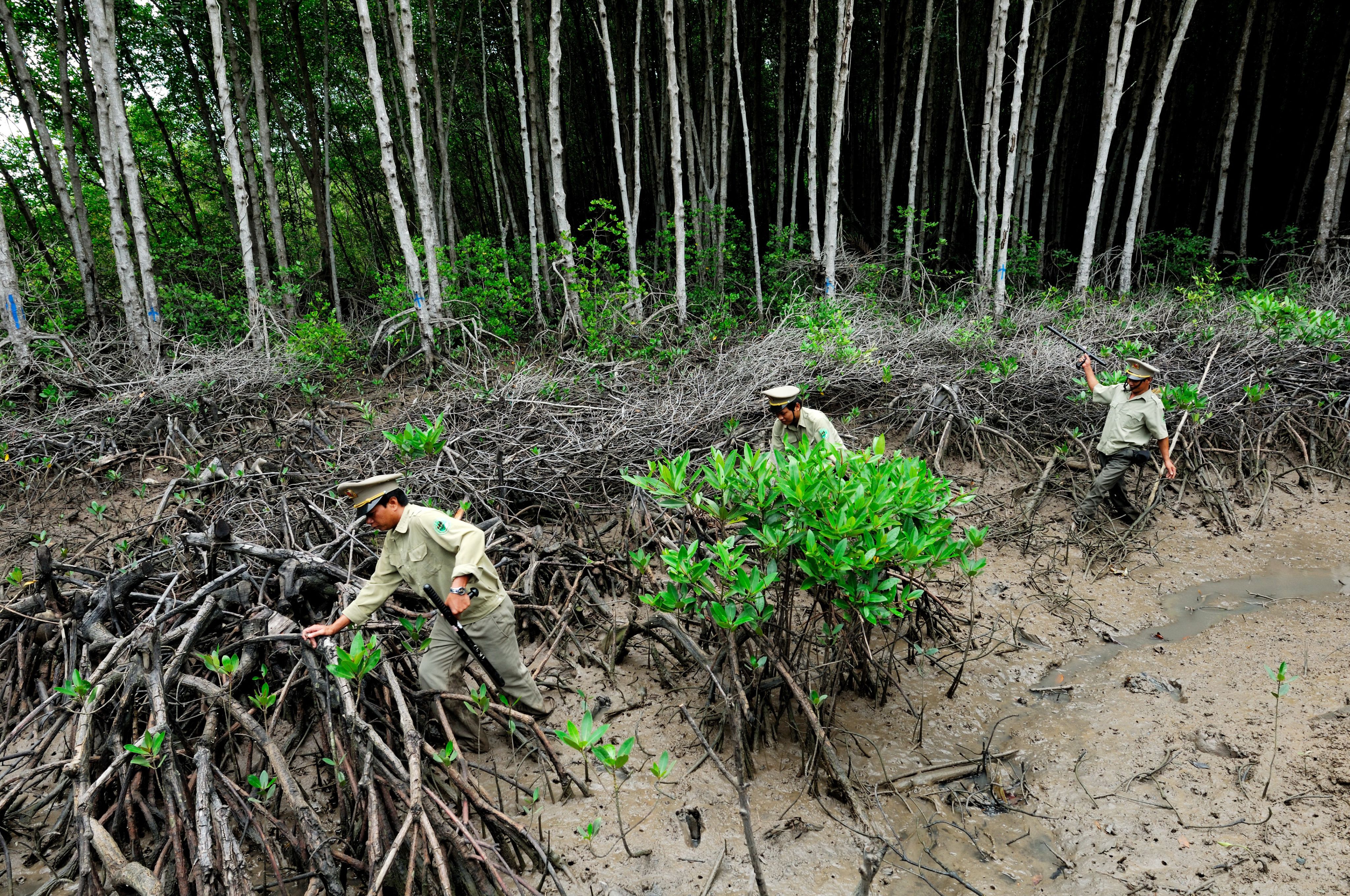Les gardes forestiers patrouillent dans les forêts de mangroves côtières, un écosystème capable d’absorber et de stocker le carbone à un niveau quatre à cinq fois supérieur à celui des forêts terrestres. Ces mangroves constituent les « poumons verts » et la « banque naturelle de carbone » du Vietnam.