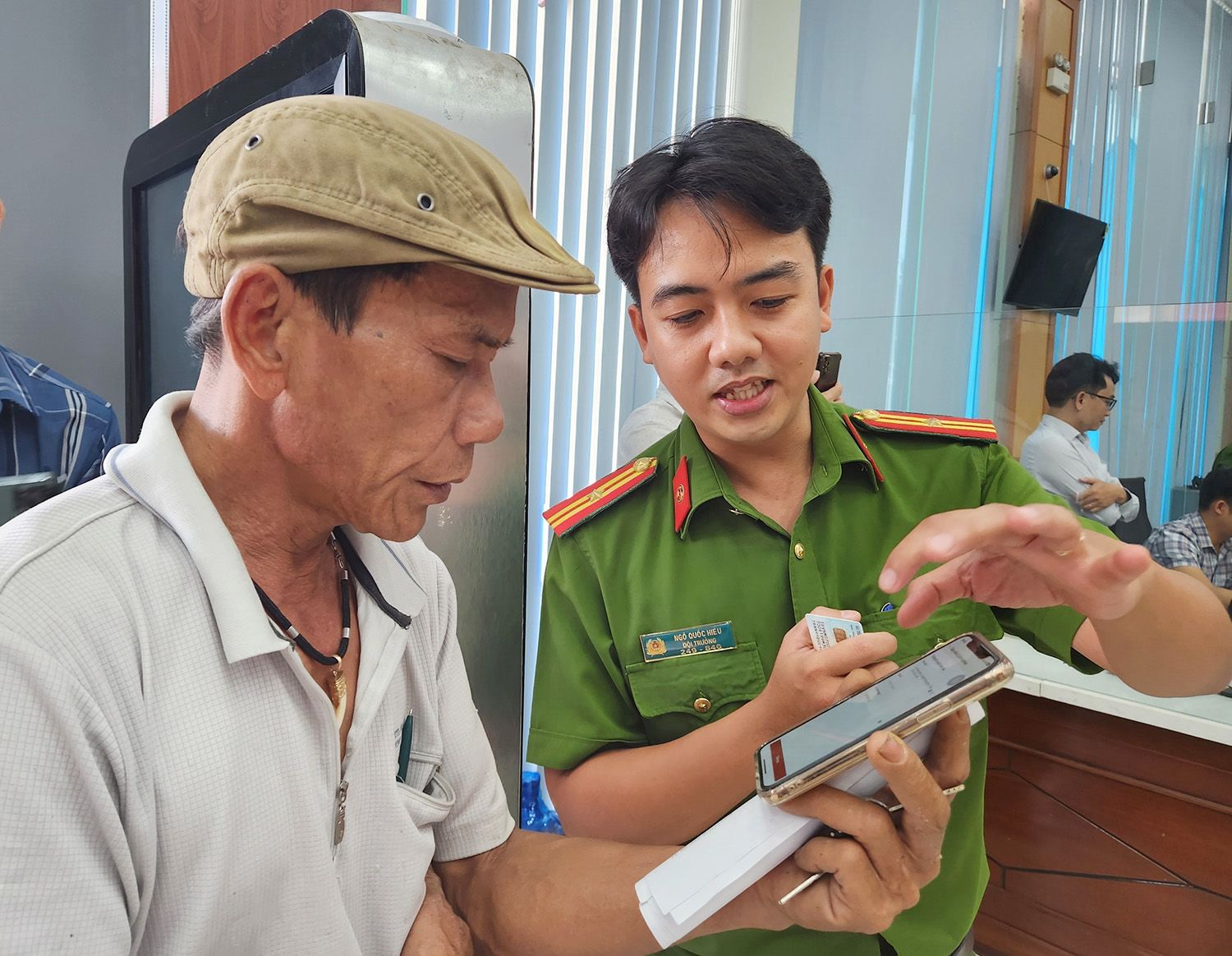 Cán bộ công an hướng dẫn người dân thao tác xin cấp phiếu lý lịch tư pháp trên ứng dụng VNeID tại Trung tâm Phục vụ hành chính công tỉnh Thừa Thiên-Huế. (Ảnh: TTXVN)