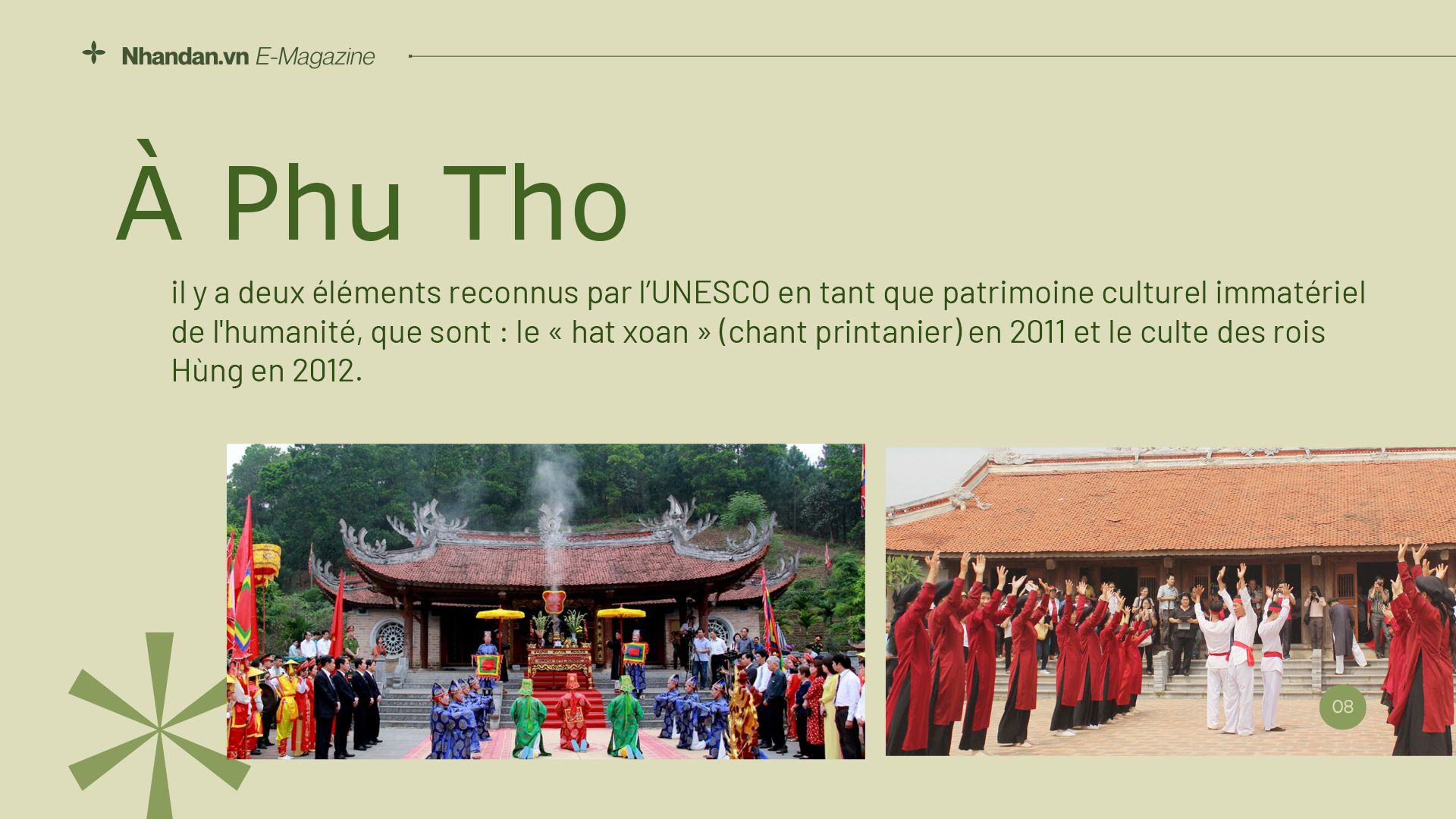 À Phu Tho, il y a deux éléments reconnus par l’UNESCO en tant que patrimoine culturel immatériel de l'humanité, que sont : le « hat xoan » (chant printanier) en 2011 et le culte des rois Hùng en 2012.