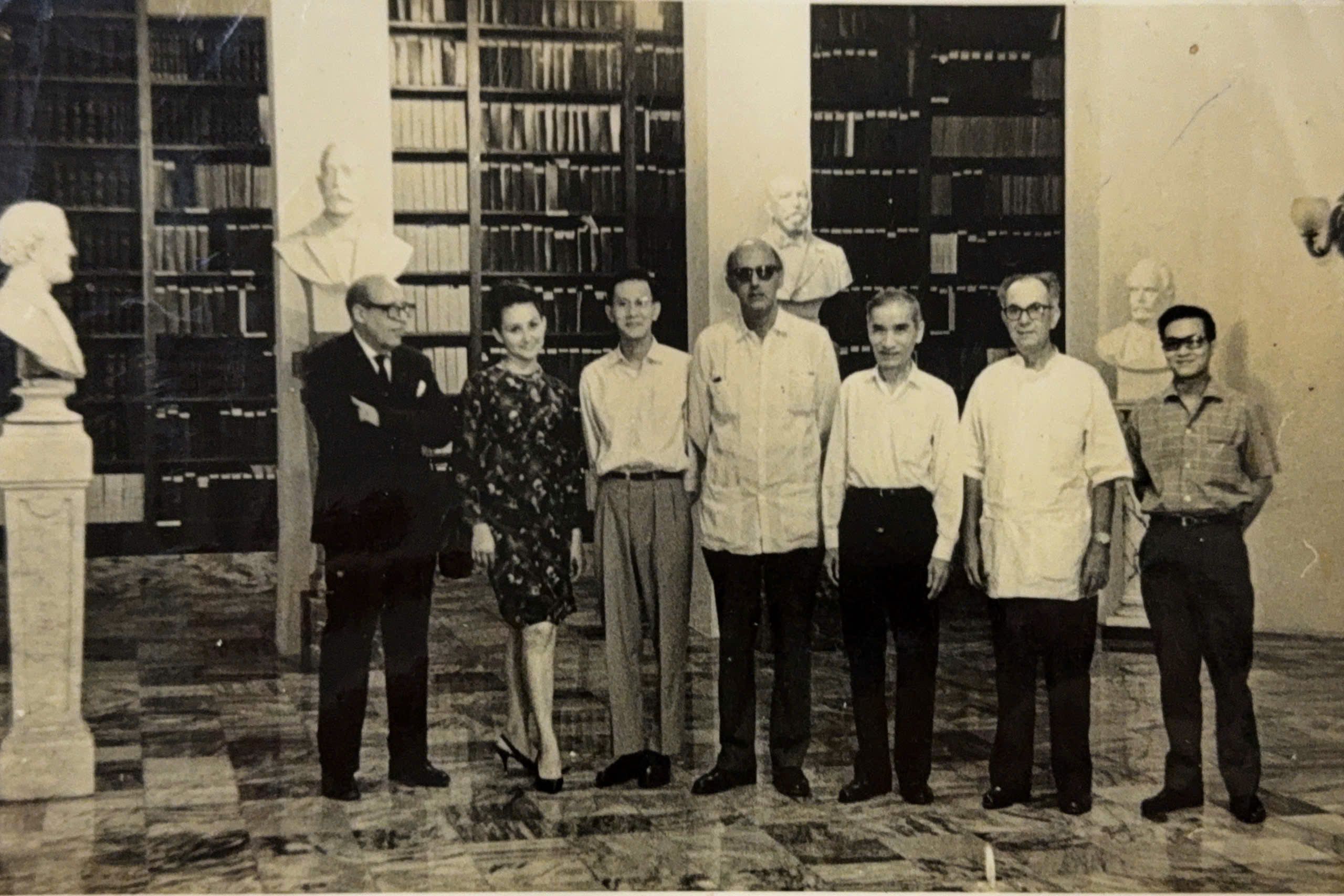 Ông Nguyễn Văn Thọ (ngoài cùng bên phải) chụp ảnh cùng đoàn của Giáo sư Ca Văn Thỉnh, Giám đốc Thư viện Khoa học Xã hội Trung ương, trong chuyến thăm và làm việc của đoàn tại Cuba, tháng 10/1968. (Ảnh: Nhân vật cung cấp)