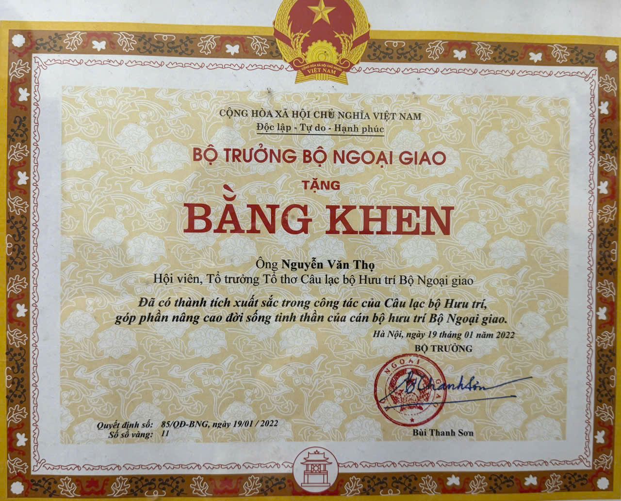 Bằng khen Bộ trưởng Bộ Ngoại giao trao tặng ông Nguyễn Văn Thọ vì đã có thành tích xuất sắc trong hoạt động của Câu lạc bộ Hưu trí. (Ảnh: Thanh Hằng)