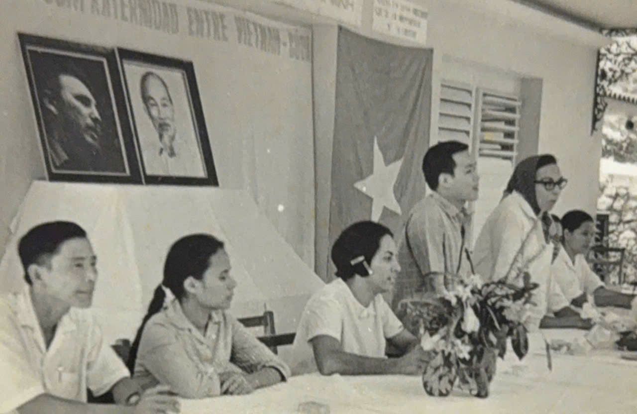 Ông Nguyễn Văn Thọ (thứ ba từ phải sang) phiên dịch cho bà Melba Hernández Rodríguez del Rey trong chuyến thăm khu ký túc xá của lưu học sinh Việt Nam tại Syboney, La Habana, tháng 10/1968. (Ảnh: Nhân vật cung cấp)