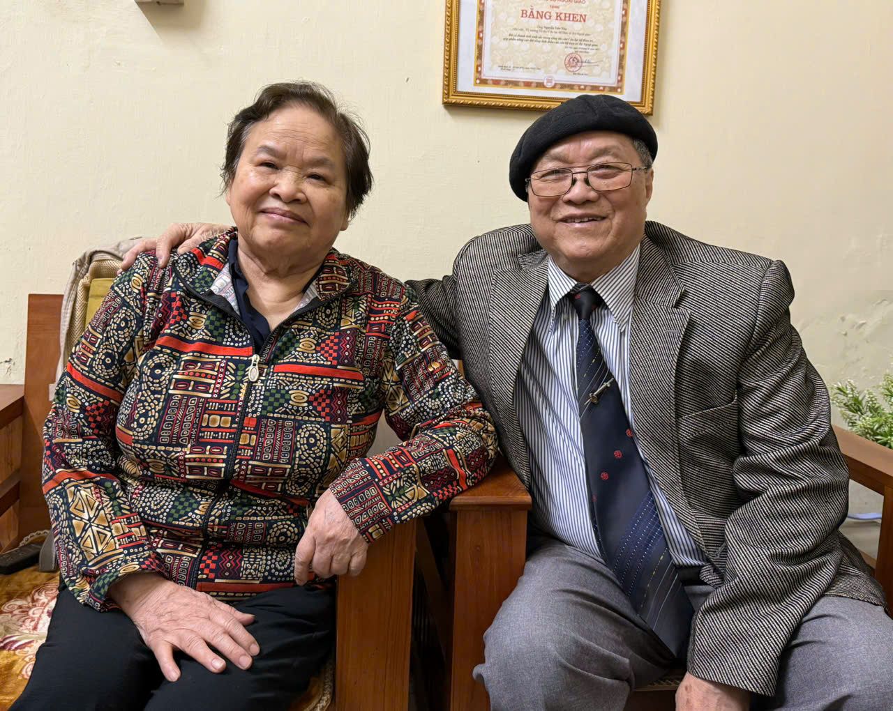 Ông Nguyễn Văn Thọ và bà Phạm Thị Nam chụp ảnh kỷ niệm tại nhà riêng, ngày 6/4/2025. (Ảnh: Thanh Hằng)