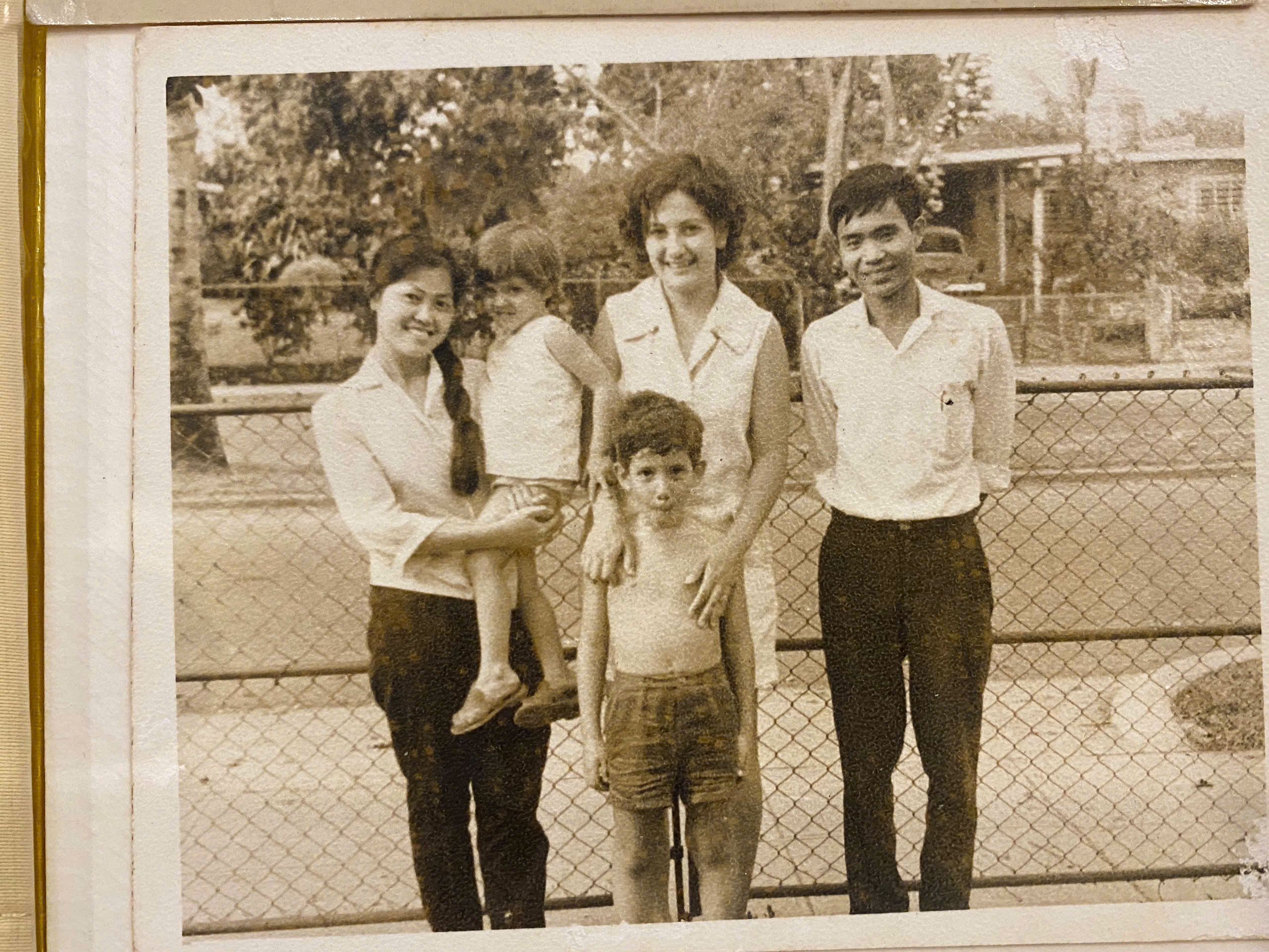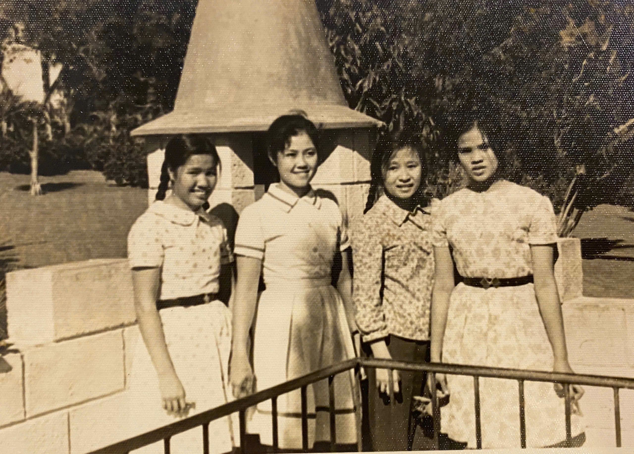 Bà Lương Kim Thái (đầu tiên bên trái) và bạn bà, ông Đinh Quang Hưng, đến thăm nhà giáo viên, khoảng năm 1968-1969-1970. (Ảnh: Nhân vật cung cấp)