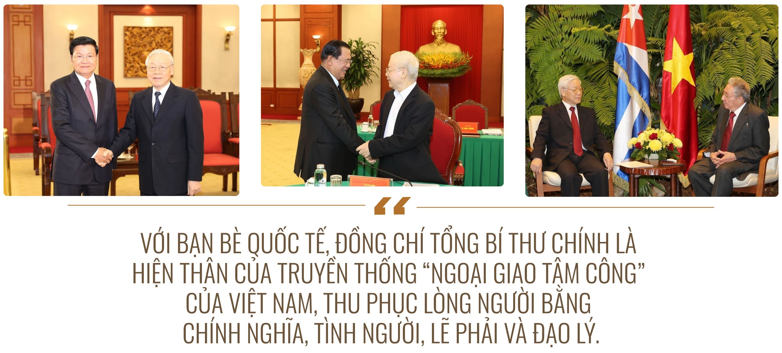Có thể nói, với bạn bè quốc tế, đồng chí Tổng Bí thư chính là hiện thân của truyền thống “ngoại giao tâm công” của Việt Nam, thu phục lòng người bằng chính nghĩa, tình người, lẽ phải và đạo lý. Trong mọi hoạt động đối ngoại, với phong cách giản dị, cởi mở, chân thành, với cách ứng xử ngoại giao vừa chuẩn mực, vừa nghĩa tình, đồng chí Tổng Bí thư Nguyễn Phú Trọng đã chạm đến trái tim, giành được cảm tình, sự mến phục lớn của các nhà lãnh đạo, nhân dân, bạn bè quốc tế. Đồng chí Tổng Bí thư để lại ấn tượng là một nhà lãnh đạo có tấm lòng rộng mở, toát lên tư duy và tầm nhìn chiến lược, luôn thúc đẩy lợi ích quốc gia-dân tộc mình nhưng cũng luôn tôn trọng lợi ích của bạn bè quốc tế, luôn phấn đấu trên tinh thần “phát huy điểm đồng, giảm thiểu khác biệt” để tìm kiếm mẫu số chung thúc đẩy quan hệ hữu nghị và hợp tác.