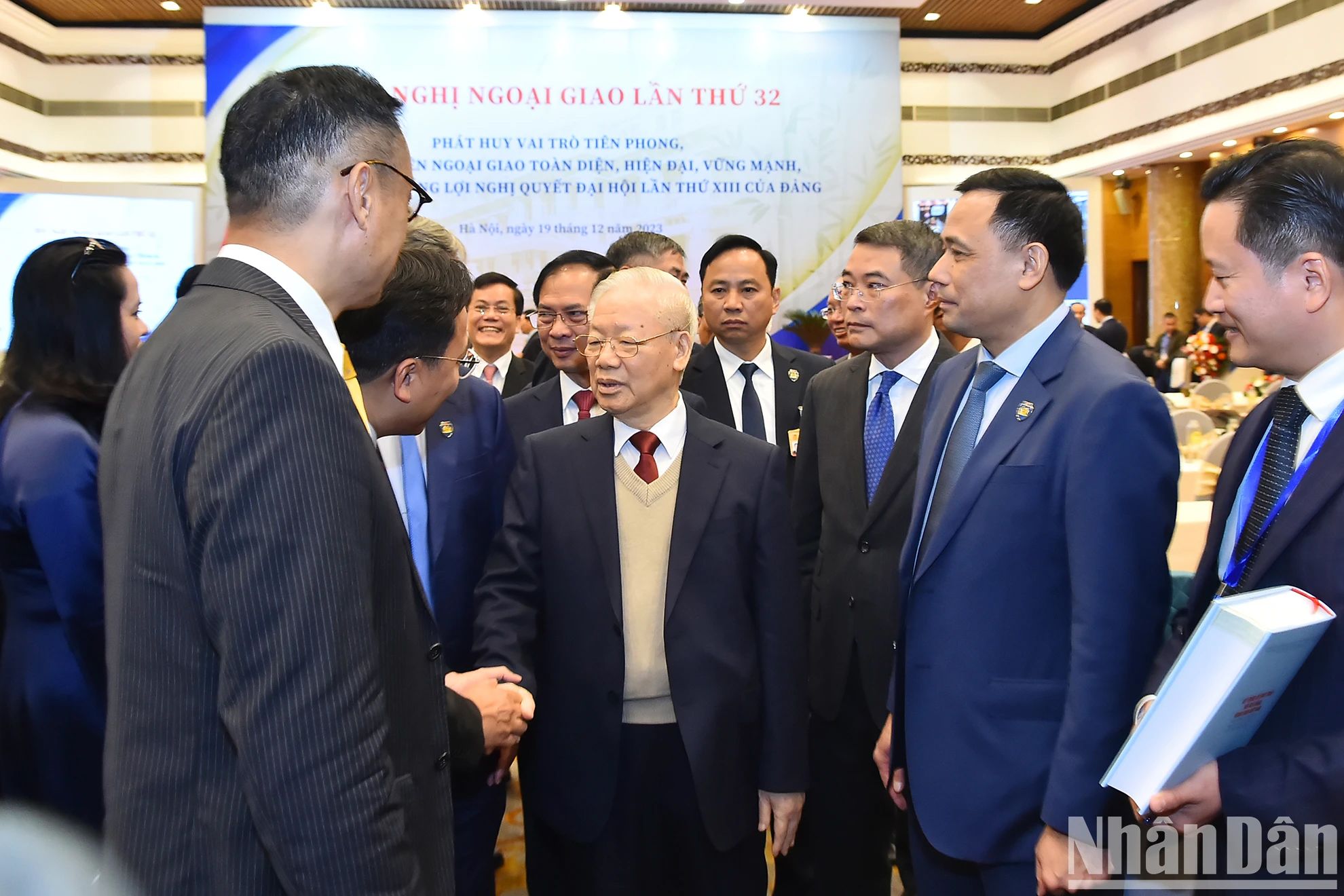 Tổng Bí thư Nguyễn Phú Trọng trao đổi với các đại biểu tại phiên khai mạc Hội nghị Ngoại giao lần thứ 32. (Ảnh: THỦY NGUYÊN)