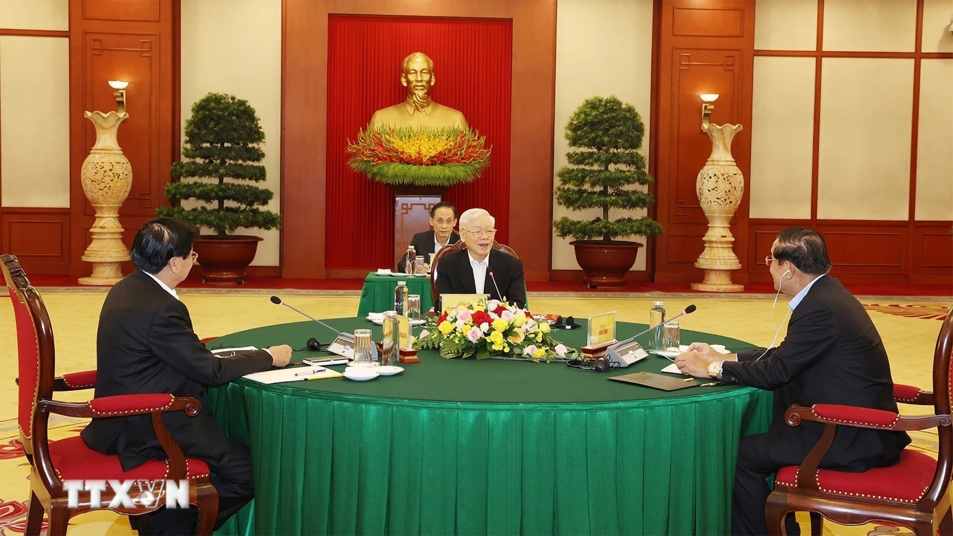 Với các nước láng giềng núi liền núi, sông liền sông Lào và Campuchia, đồng chí Tổng Bí thư Nguyễn Phú Trọng là người luôn quan tâm quy tụ, vun đắp cho mối quan hệ đoàn kết, hữu nghị, hợp tác đặc biệt này, thể hiện rõ nhất là các cuộc gặp cấp cao nhất lãnh đạo ba Đảng sau 30 năm tại Hà Nội năm 2021 và 2023.