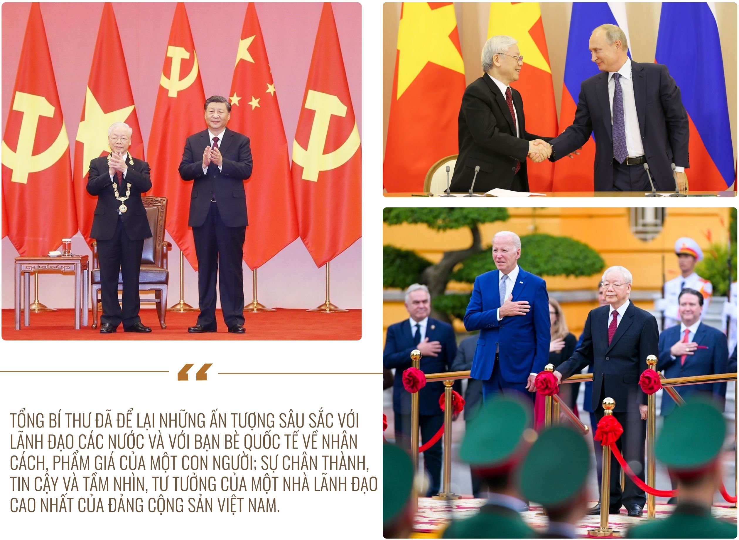 Với các nước lớn như Nga, Hoa Kỳ, đồng chí Tổng Bí thư là người lãnh đạo có uy tín trên trường quốc tế, có những đóng góp to lớn cho việc thiết lập quan hệ Đối tác chiến lược toàn diện với Liên bang Nga và là người đóng góp rất quan trọng trong việc tạo dựng mối quan hệ sâu sắc và đầy đủ giữa Việt Nam và Hoa Kỳ. Tổng thống Nga Vladimir Putin nhắc đến đồng chí Tổng Bí thư Nguyễn Phú Trọng như một người bạn tuyệt vời, một người bạn thực sự có đóng góp cá nhân to lớn cho việc thiết lập và phát triển quan hệ Đối tác chiến lược toàn diện giữa Moskva và Hà Nội. Tổng thống Hoa Kỳ Joe Biden nhấn mạnh nhờ tình hữu nghị giữa hai nước mà người dân Việt Nam và Hoa Kỳ cũng như người dân trên khắp khu vực Ấn Độ Dương-Thái Bình Dương ngày nay được sống trong môi trường an ninh và những cơ hội lớn hơn. “Đó là nhờ công lao của Tổng Bí thư Nguyễn Phú Trọng”.