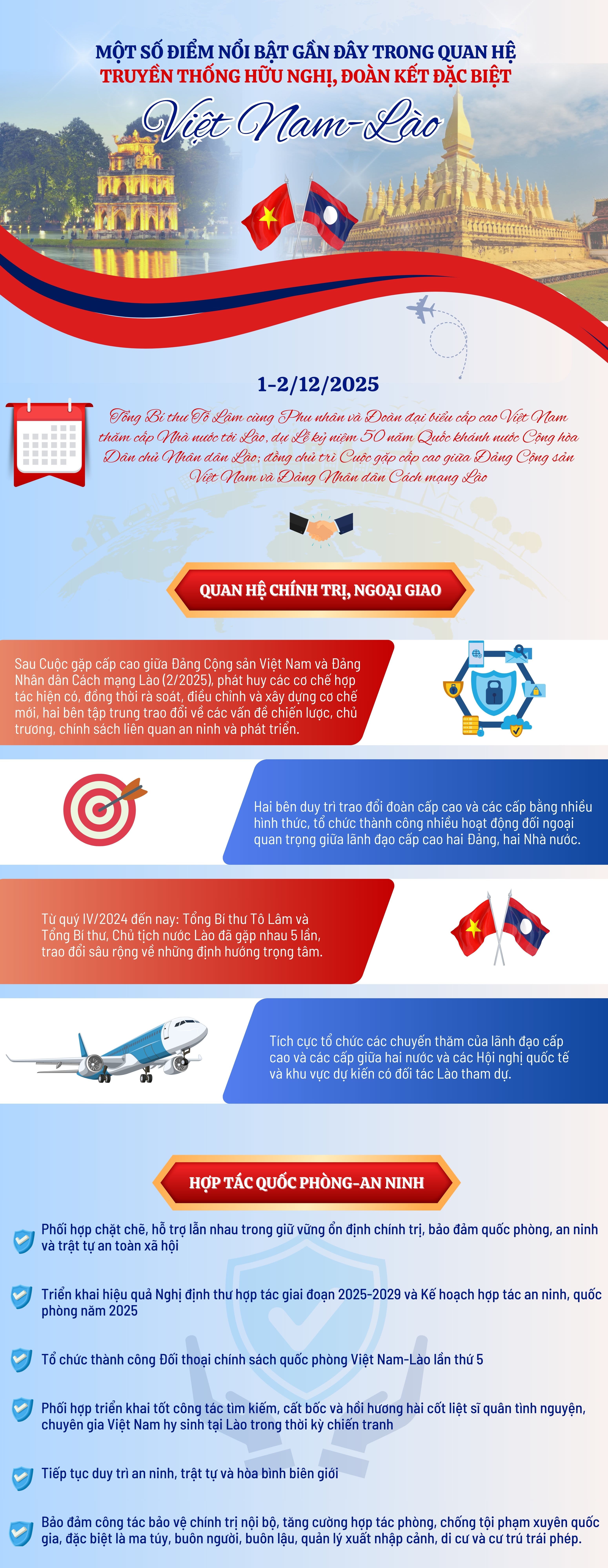 Quan hệ chính trị, ngoại giao tiếp tục phát triển tốt đẹp, gắn bó, tin cậy. Sau Cuộc gặp cấp cao giữa hai Đảng Cộng sản Việt Nam và Đảng Nhân dân Cách mạng Lào (02/2025), phát huy các cơ chế hợp tác hiện có, đồng thời rà soát, điều chỉnh và xây dựng cơ chế mới, hai bên tập trung trao đổi về các vấn đề chiến lược, chủ trương, chính sách liên quan đến an ninh và phát triển.