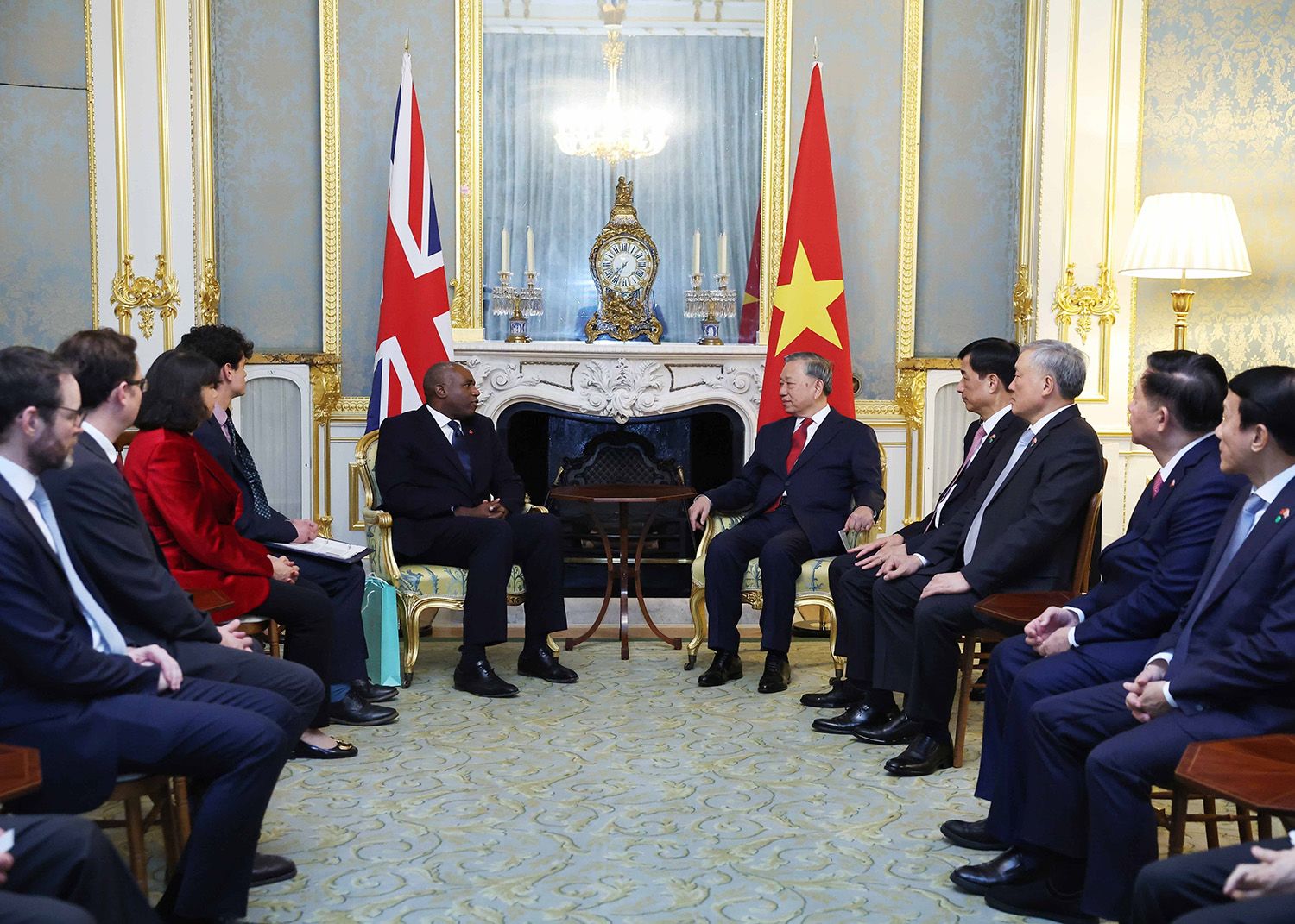Gặp Phó Thủ tướng Anh David Lammy, Tổng Bí thư chia sẻ rằng, Phó Thủ tướng David Lammy là lãnh đạo đầu tiên của Anh mà Tổng Bí thư gặp sau khi hai nước chính thức nâng cấp quan hệ lên Đối tác chiến lược toàn diện và đề nghị ngay sau chuyến thăm, Chính phủ hai bên xây dựng Kế hoạch hành động, nhanh chóng củng cố các cơ chế hợp tác hiện có và thiết lập mới các cơ chế cần thiết, để đẩy mạnh hợp tác, tăng cường tin cậy chính trị, sớm đưa kim ngạch thương mại hai nước đạt mục tiêu 15 tỷ USD.