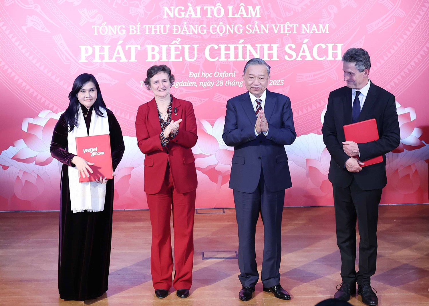 Trong khuôn khổ chuyến thăm, Tổng Bí thư Tô Lâm và Đoàn đại biểu cấp cao Việt Nam đã gặp Ban lãnh đạo Đại học Oxford, Vương quốc Anh. Nhân dịp này, Tổng Bí thư Tô Lâm đã phát biểu chính sách trước các giáo sư, giảng viên, nhà nghiên cứu và đông đảo sinh viên, bạn bè của Việt Nam tại Đại học Oxford.
