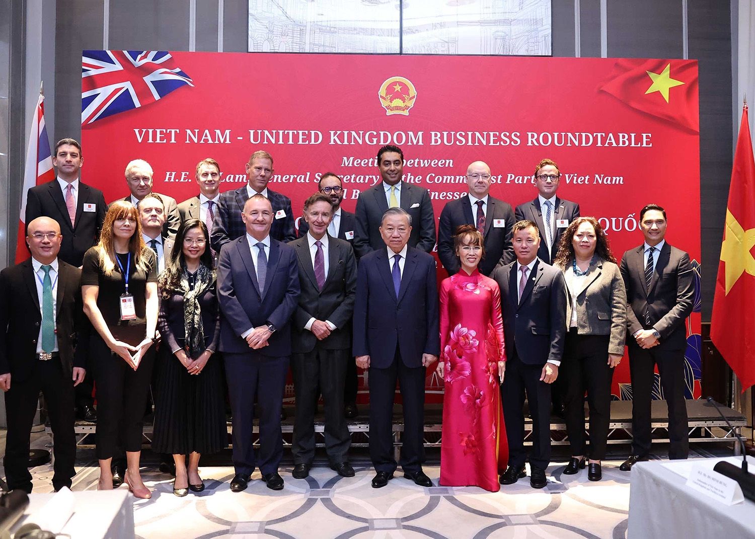 Để phát huy tối đa tiềm năng của hai nước, Tổng Bí thư Tô Lâm đề nghị doanh nghiệp Anh tiếp tục mở rộng hoạt động đầu tư, kinh doanh trong các lĩnh vực Anh có kinh nghiệm thế mạnh, Việt Nam có tiềm năng và nhu cầu như: kinh tế xanh, kinh tế số, kinh tế tri thức, kinh tế tuần hoàn, công nghệ cao… Tổng Bí thư Tô Lâm khẳng định, với quyết tâm cao, tầm nhìn xa, khát vọng lớn, mục tiêu “vươn mình trong kỷ nguyên mới” của Việt Nam không chỉ là nhiệm vụ mà còn là mệnh lệnh của thời đại và sứ mệnh của lịch sử. Sứ mệnh đó đòi hỏi sự đồng hành, hợp tác và chia sẻ của cộng đồng đối tác quốc tế, trong đó có Vương quốc Anh.