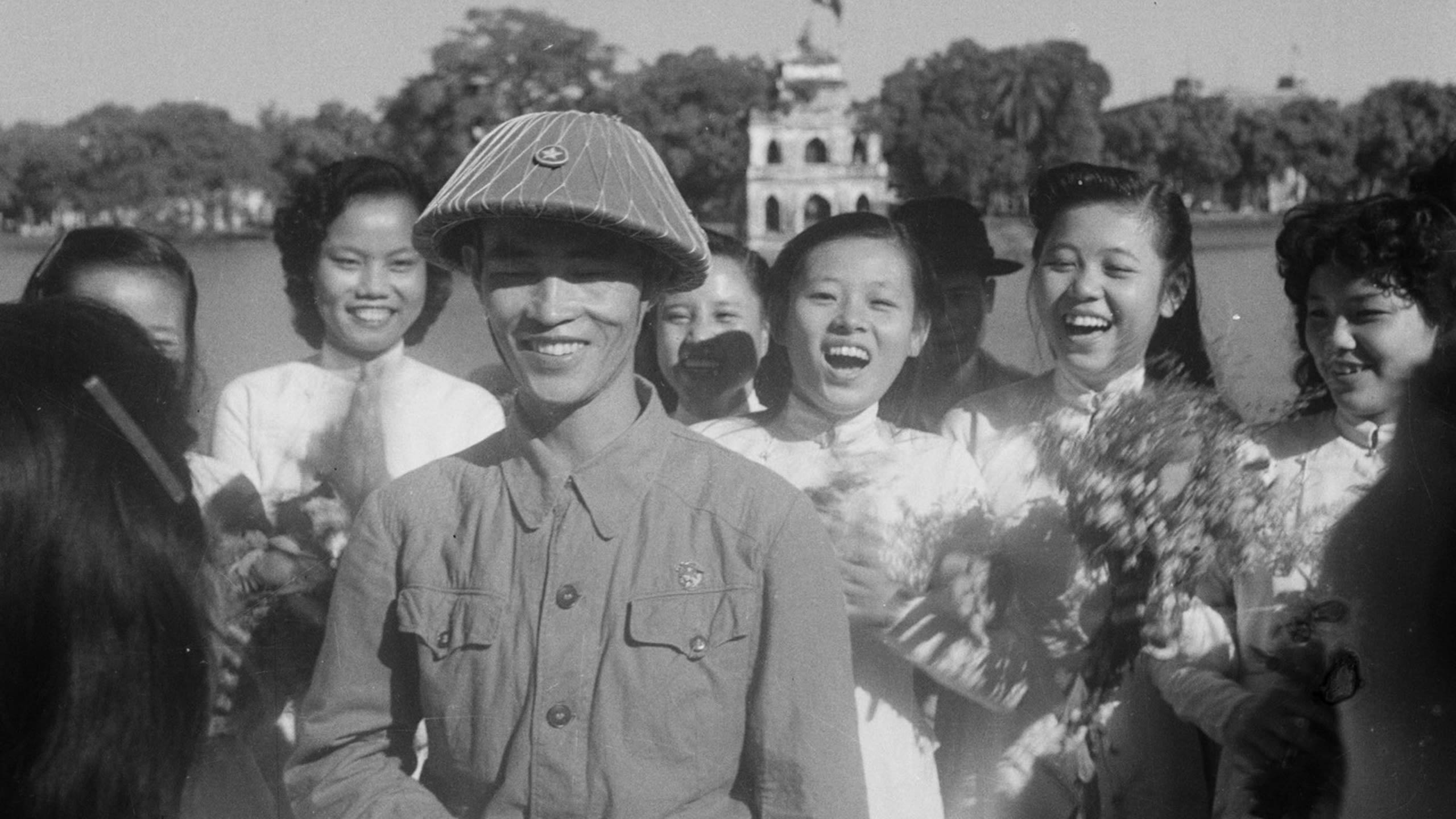 Thiếu tướng Vương Thừa Vũ, Tư lệnh Đại đoàn 308, Chủ tịch Ủy ban Quân chính Thành phố nhận hoa chúc mừng từ các nữ sinh trường Trưng Vương bên hồ Hoàn Kiếm trong ngày giải phóng Thủ đô. Ảnh: TTXVN