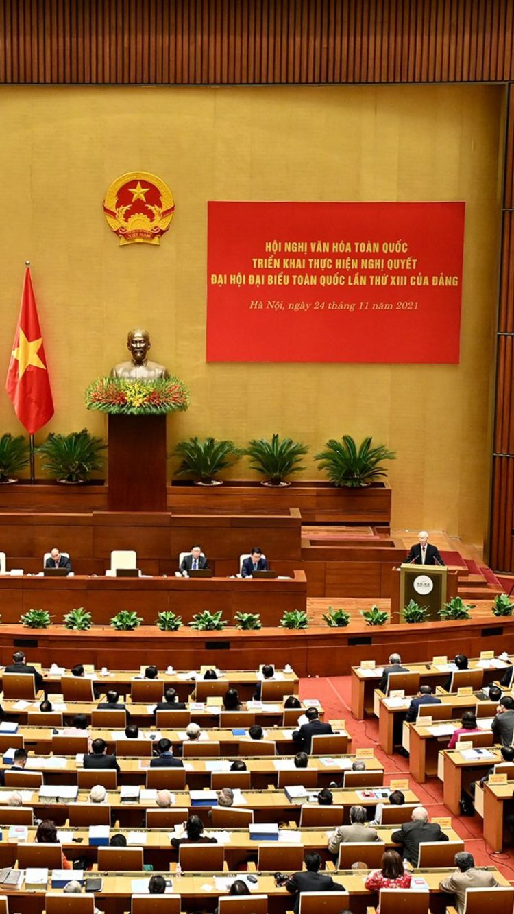 Our National Cultural Conference today is an important occasion for the entire Party, people and army, especially people working in the field of culture, intellectuals, writers and artists of the whole country, to thoroughly, comprehensively and synchronously grasp Ho Chi Minh's thought and the lines, guidelines and viewpoints of our Party, especially the viewpoint of the 13th National Party Congress on building, preserving and promoting the unique values of an advanced Vietnamese culture imbued with national identity. Together, we have a deeper, more complete, and more comprehensive awareness of the particularly important role and position of culture in the cause of national construction and defence, as well as in realising the aspiration to develop a prosperous and happy country, worthy of the renovation cause and the glorious historical traditions of thousands of years of civilization.