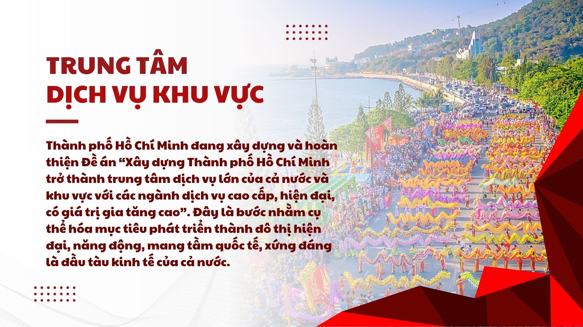 • Xây dựng và triển khai Đề án “Xây dựng Thành phố trở thành trung tâm dịch vụ lớn của cả nước và khu vực với các ngành dịch vụ cao cấp, hiện đại, có giá trị gia tăng cao”.